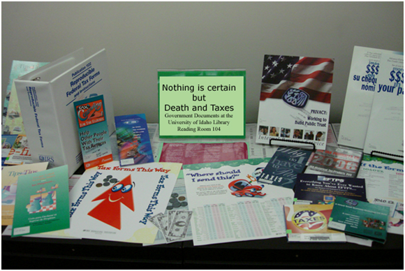 "Nothing is Certain but Death and Taxes" is the display in the Combined Reading Room on the 1st floor of the University of Idaho Library. This display highlights the many government documents available in the collection which deal with various aspects of the income tax, everything from where to send tax returns and an explanation of why the tax needs to be paid to how to volunteer to help others with their tax returns. These documents richly supplement the annual service provided by the department in making tax forms and publications handy.