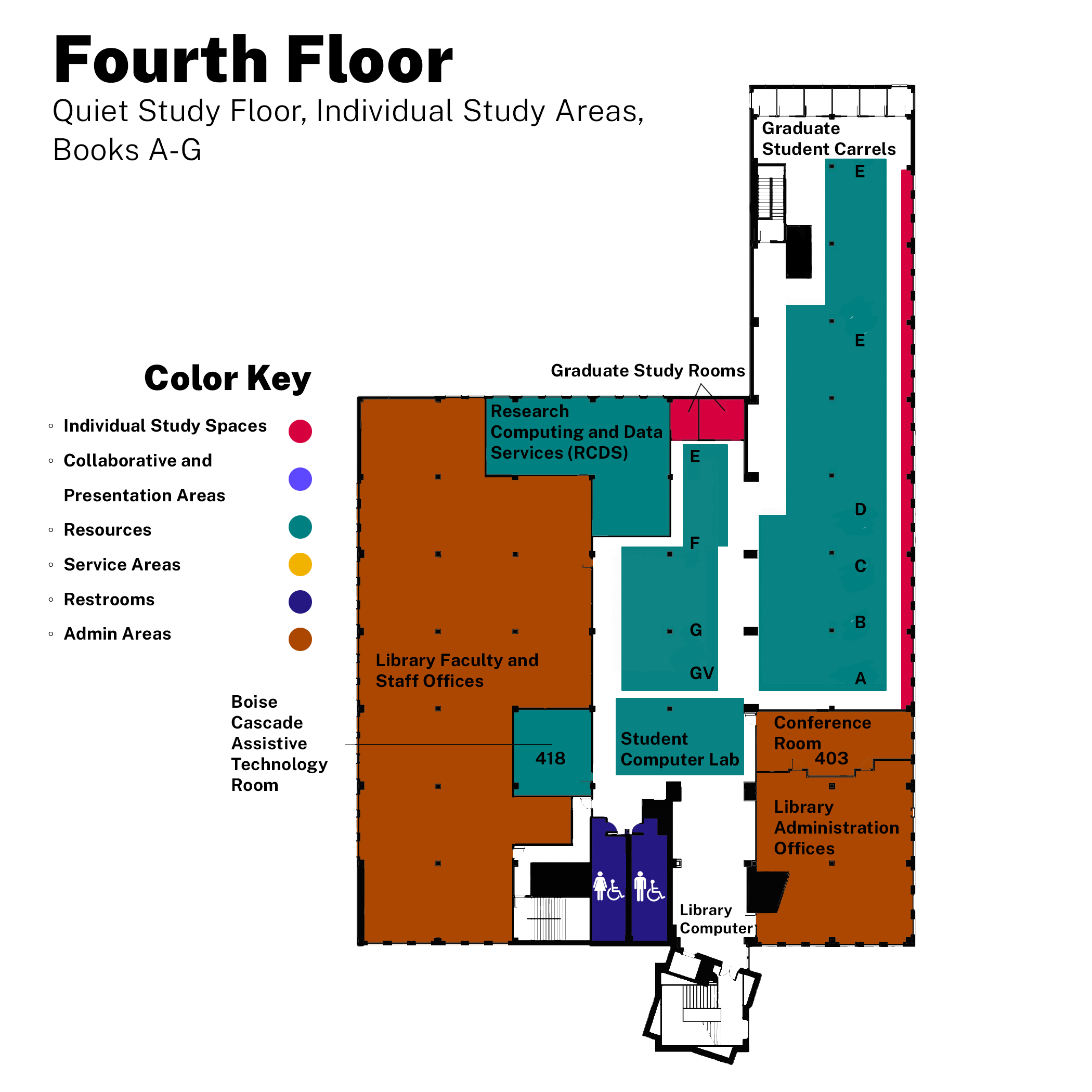- Spaces: Living Room, Student Computer Lab & Printers, Instruction Room 120, Map Room, Fishbowl, Group Study Rooms