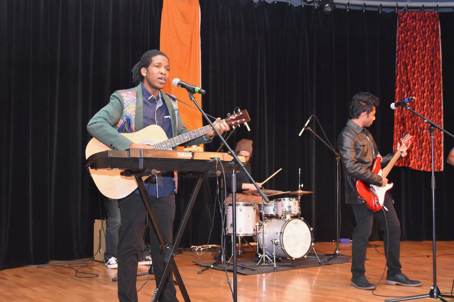 - dj Goz (acoustic guitar), Labib Sharar Ehsan (electric guitar), and Caleb Murdock (drums) perform at the 2017 Africa Night.