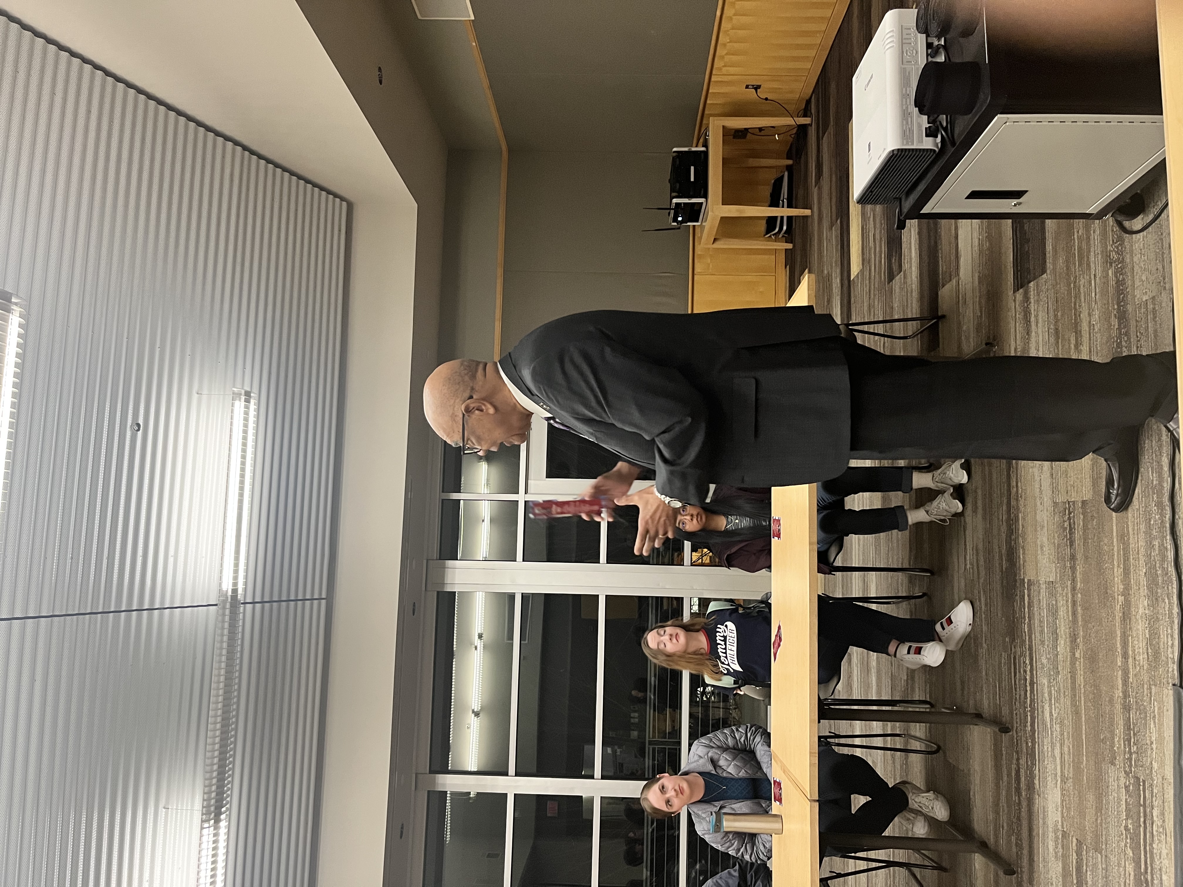 - Bob Pipkin gives his keynote address as students listen and watch.