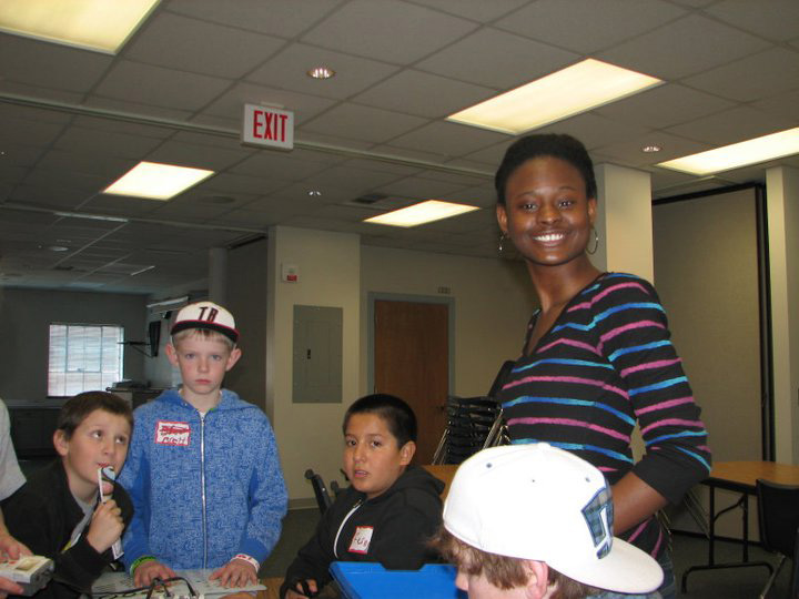 - NSBE member helping students with an activity at an engineering outreach event in 2011.