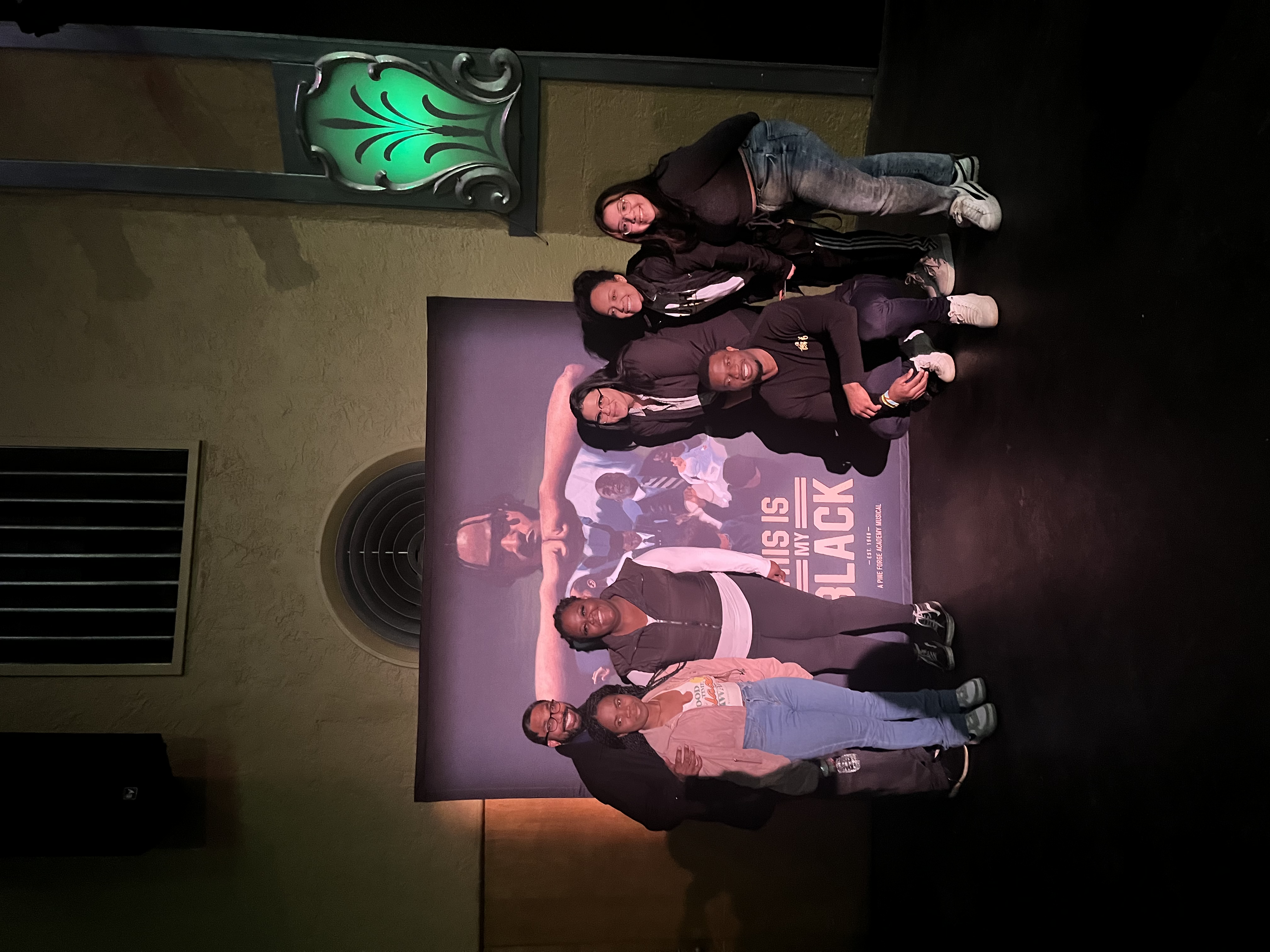 - Mario Pile and students standing in front of the "This is My Black" movie poster at the Kenworthy Theatre.