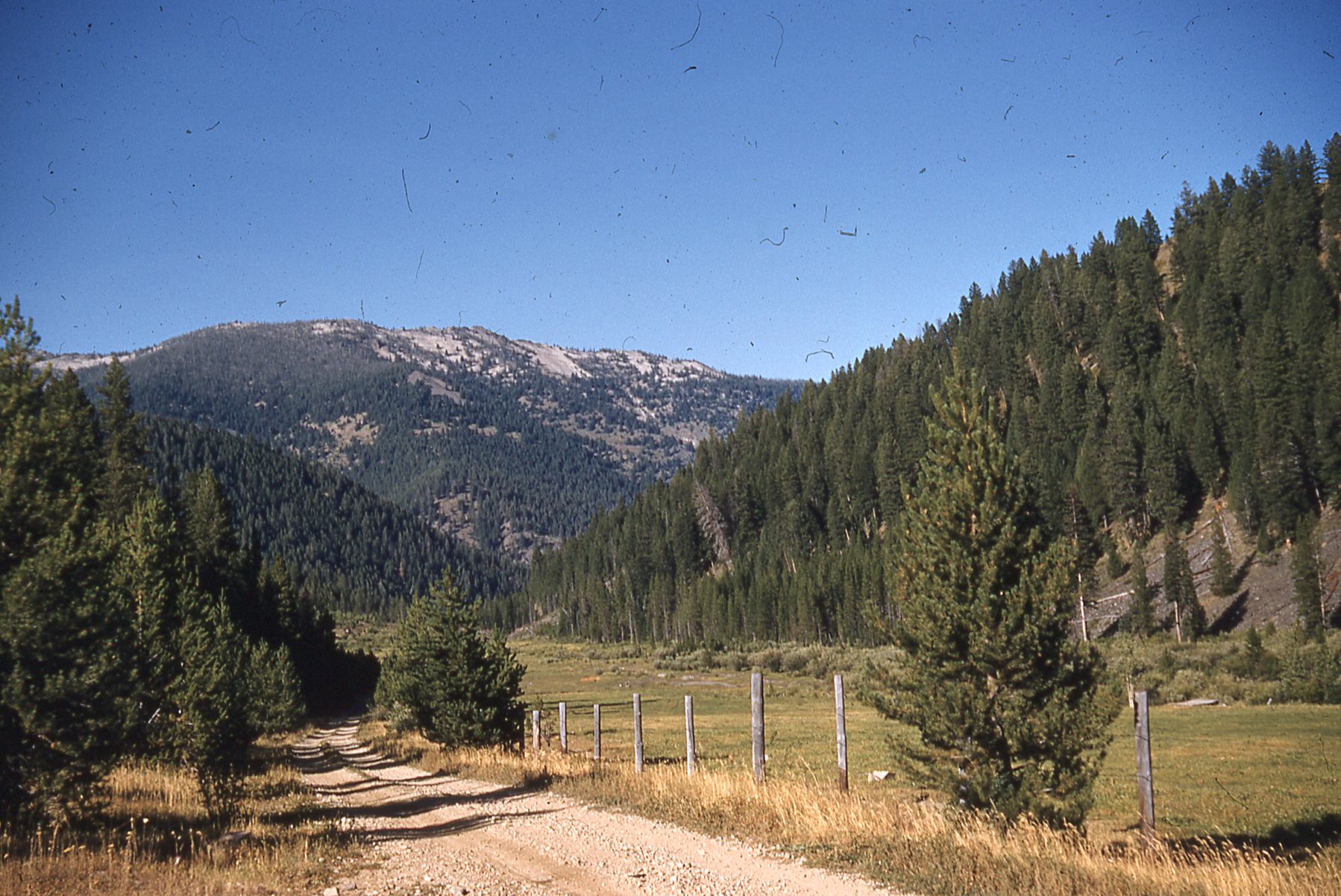 The Big Creek airstrip is north of Edwardsburg and just up the road from the Big Creek Lodge. This area hasn’t experienced significant wildfire for approximately 100 years. Evident in these photographs are consistent dense stands of conifers on the hogback to the viewers right of the airstrip, and on McFadden Mountain in the background. One change is the removal of fencing along the airstrip. Originally used to keep stock and elk herds off of the runway, its absence speaks to changes both in elk populations and methods of backcountry access.