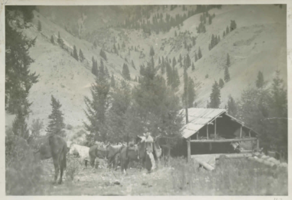 Big Creek and the Cliff Creek drainage are in view in these repeat photographs, as well as the Lewis Cabin. The Lewis Cabin has had some building and foundation restoration work done throughout the years, with the addition of the section behind the main cabin as well. In the early 20th century, Dave Lewis was living on his homestead here. While the fire pit in the contemporary photograph cannot be seen in the historical photo, it is historically significant. Around this fire pit, the conception of the Idaho Primitive Area was spawned, an action of land preservation that would eventually turn the area into the Frank Church-River of No Return Wilderness. For this to have happened on the Dave Lewis homestead holds significance for those who are connected with the Frank Church-River of No Return Wilderness through Taylor Wilderness Research Station.