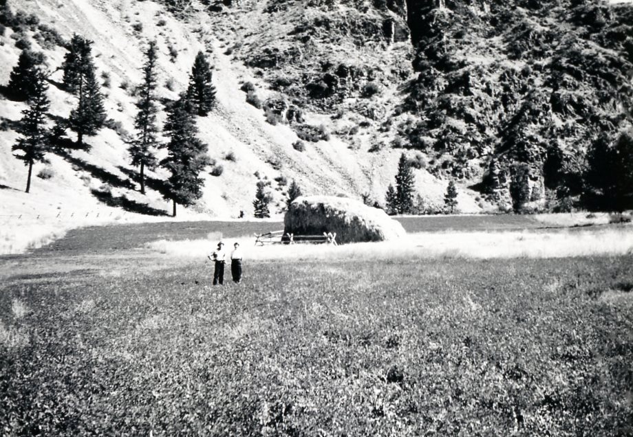When using horses and mules to pack supplies and travel throughout the area was commonplace, the animals couldn’t always be let out to roam and graze. Aside from the grasses available in their pastures, the stock was sustained by hay. Jess and Dorothy Taylor, shown in the historical photograph here, stand in front of a massive pile of cut hay in the lower pasture on Taylor Wilderness Research Station property, back when it was the Taylor Ranch. Driving mule teams to cut hay for the stock at Taylor Wilderness Research Station was a practice that persisted well into the second term of scientists and caretakers Jim and Holly Akenson.