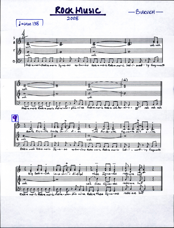 - This piece was written to help individual students study for their Geology exam. This course was taught by Mickey Gunter at the University of Idaho. Somebody mentioned that they were going to study for this test while leaving Jazz Choir, and wanted Bukvich to write a piece to facilitate their studies. This piece was performed at Gunter's reitrement and the piece was used as an extra credit assignment in Gunter's class for years. The piece contains a many "I vi ii V" progressions and contextual uses of minor progressions as these were topics discussed Bukvich's First Year theory class.