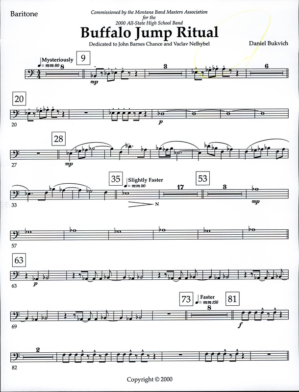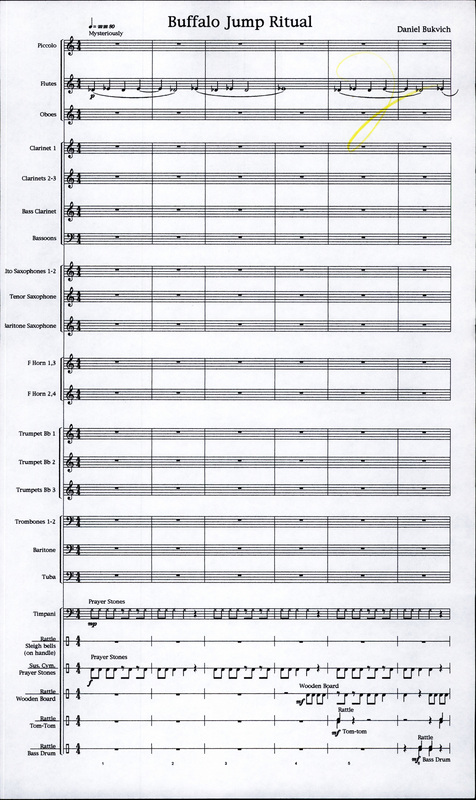 - Bukvich was approached by Bill Larson to write a comission for the Montana Music Educators Association (MMEA). Larson took Bukvich on a trip south of Great Falls to the Ulm Buffalo Jump Site. In growing up in Montana, Bukvich had heard of these sites throughout his life, but this excursion with Larson was his first time visiting one. Larson and the comissioning board opted for simple percussion that could be performed by any band program in the state of Montana; therefore, no mallet percussion was utilized for this piece. In planning this piece, Larson wanted to get the All State Band to rehearse the piece at the Buffalo Jump site, but "the band world isn't cool enough to figure out how to make that happen," according to Bukvich. Since its original premiere at MMEA 2000, it recieves an estimated hundereds of performances a year.