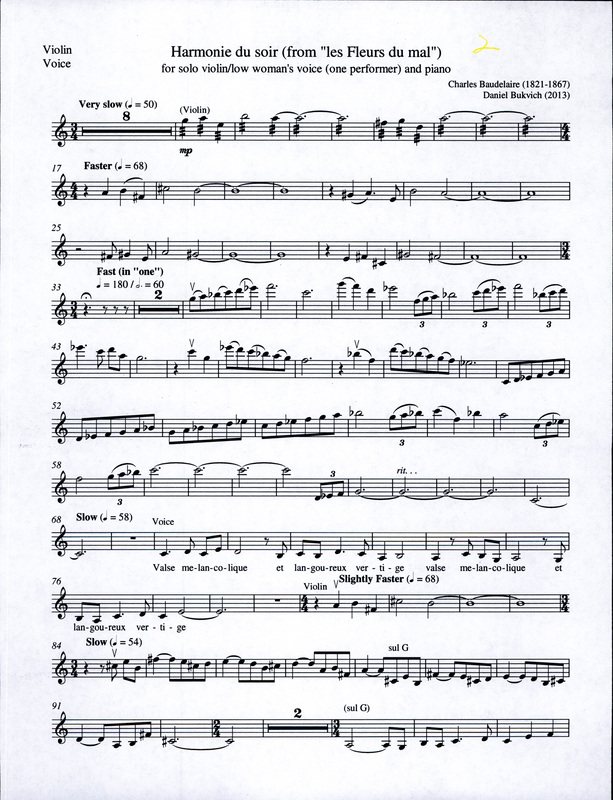 - Written for Emily Benjamin, a music and french major at the University of Idaho. She asked for a piece that she could play and sing. Benjamin picked a poem by Charles Baudelaire that Bukvich then adapted for this piece. This piece has also been performed by University of Idaho faculty members, Eneida Larti and Giselle Hillyer.