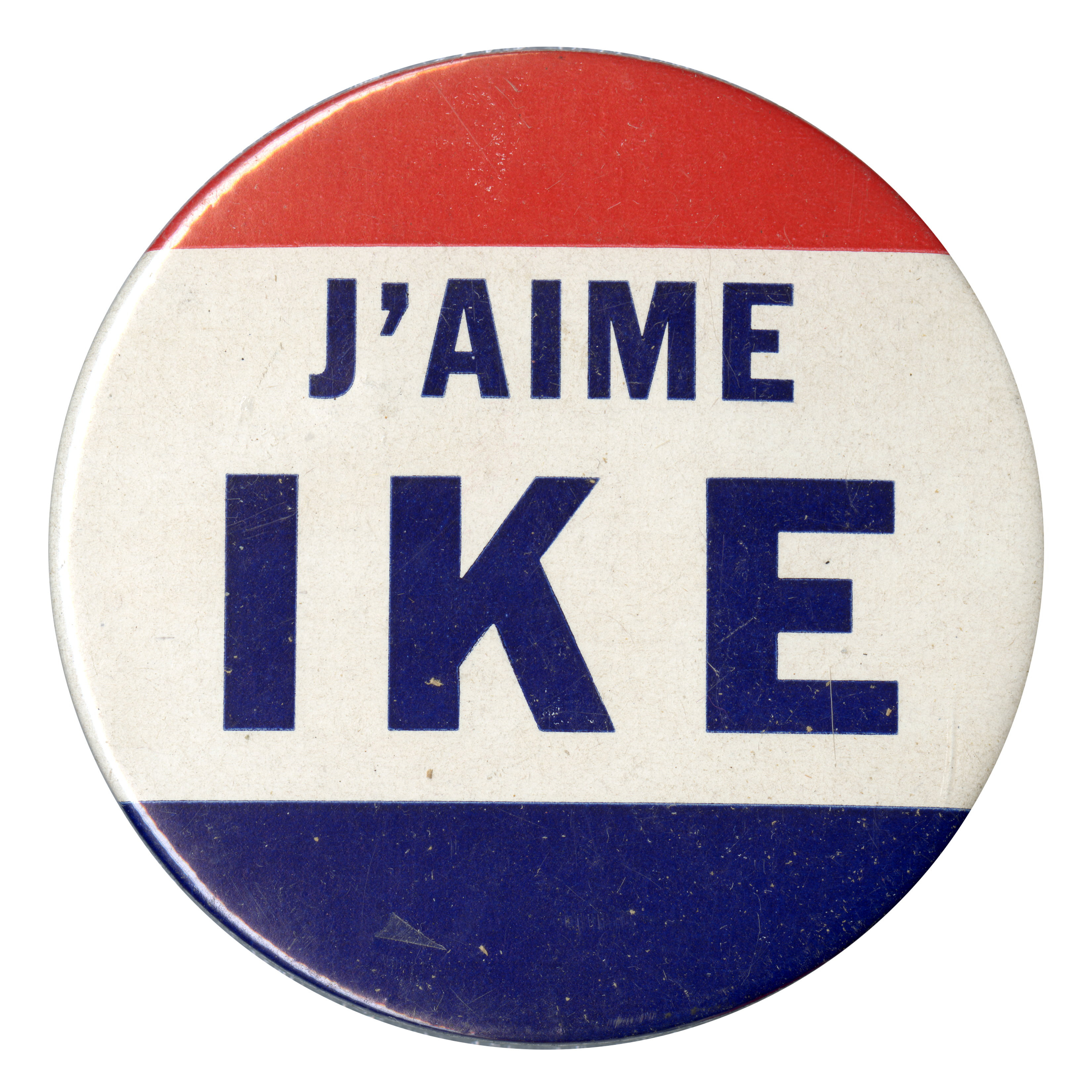 - Dwight D. Eisenhower. Republican Party nominee for President of the United States. Text on the button reads "J'aime Ike", French for "I love Ike."