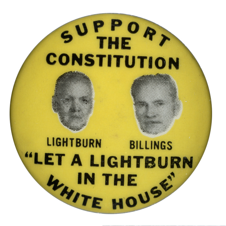 - Joseph Lightburn and Theodore Billings. Constitution Party nominees for President and Vice President of the United States. Additional button text reads "Let Lightburn in the White House."