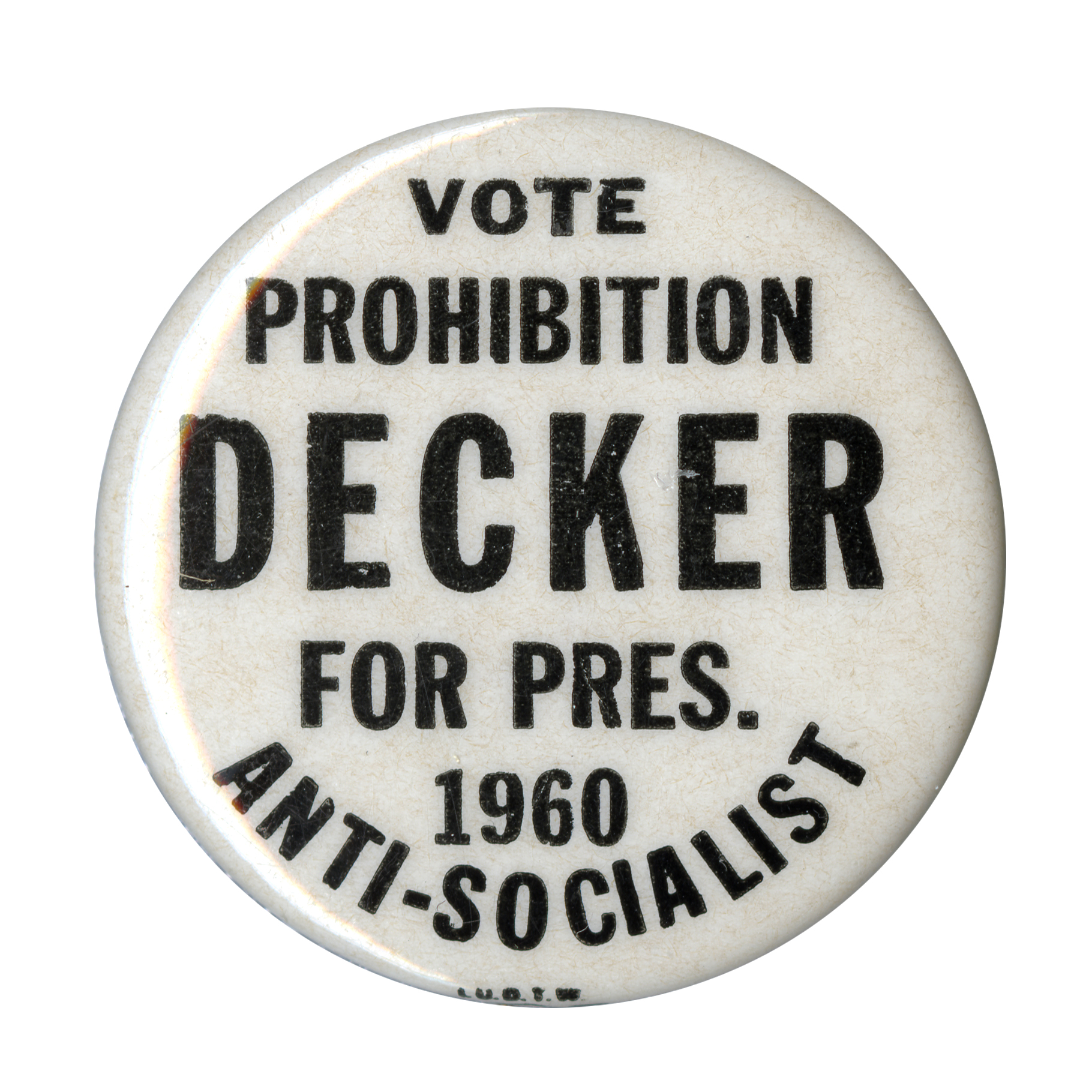 - "Vote Prohibition Decker for Pres. 1960 Anti-Socialist", Political Buttons Collection, University of Idaho Library Digital Collections, https://www.lib.uidaho.edu/digital/buttons/items/mg660_box1_7-0381.html