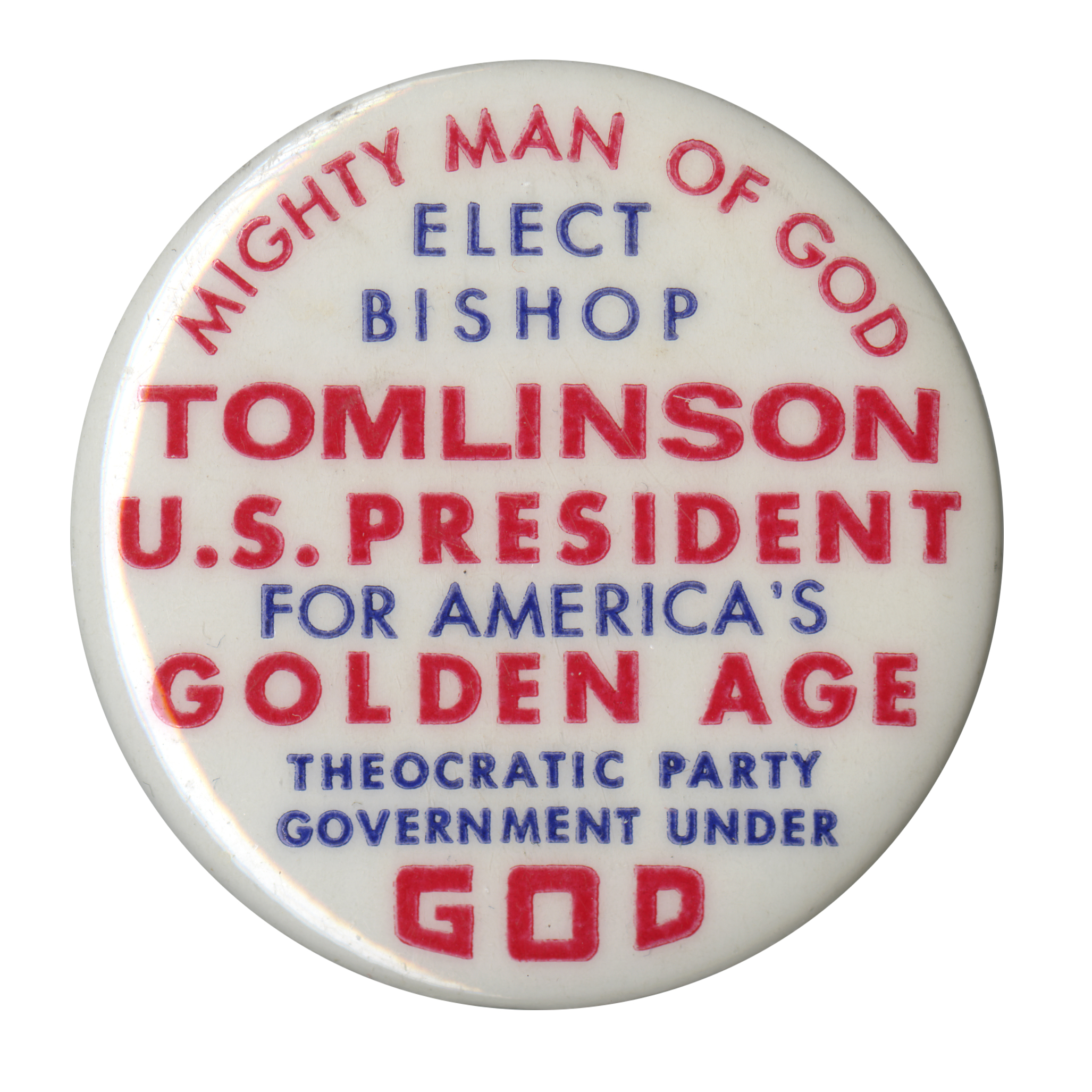 - "Might Man of God Elect Bishop Tomlinson U.S. President for America's Golden Age Theocratic Party Government Under God", Political Buttons Collection, University of Idaho Library Digital Collections, https://www.lib.uidaho.edu/digital/buttons/items/mg660_box1_9-0431.html