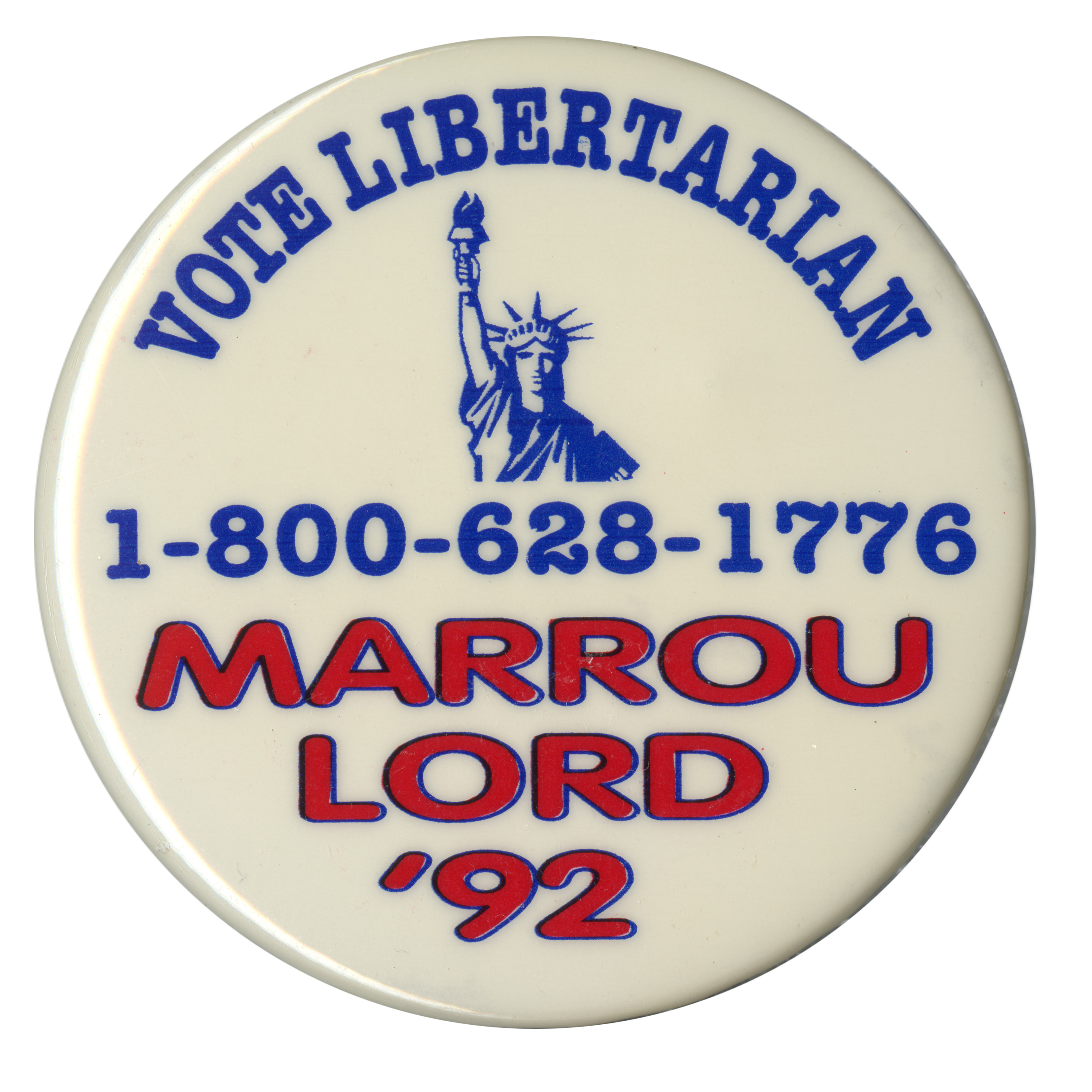 - "Vote Libertarian 1-800-628-1776 Marrou Lord '92", Political Buttons Collection, University of Idaho Library Digital Collections, https://www.lib.uidaho.edu/digital/buttons/items/mg660_box3_16_1293.html