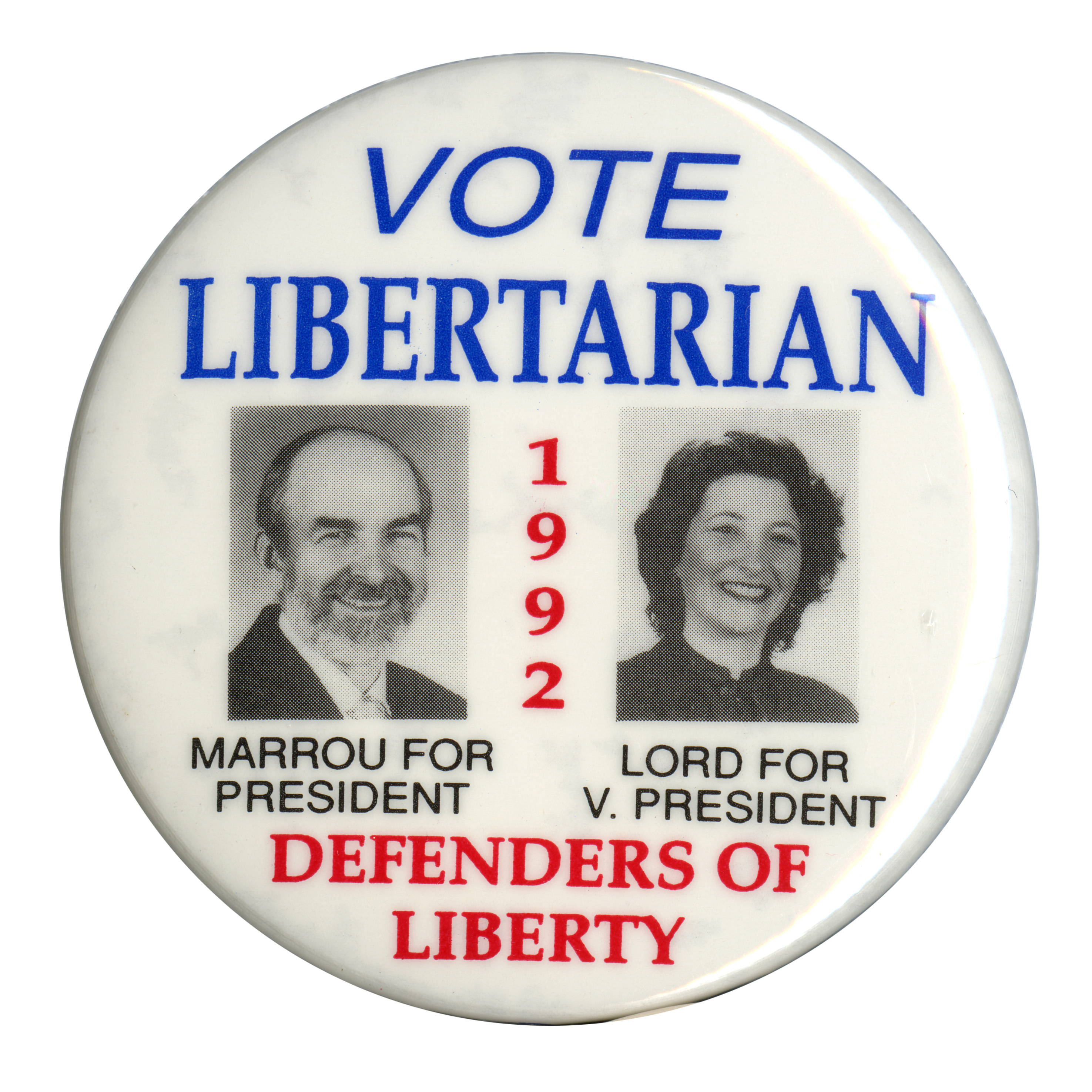 - "Vote Libertarian 1992 Marrou for President Lord for V. President Defenders of Liberty", Political Buttons Collection, University of Idaho Library Digital Collections, https://www.lib.uidaho.edu/digital/buttons/items/mg660_box3_16_1294.html