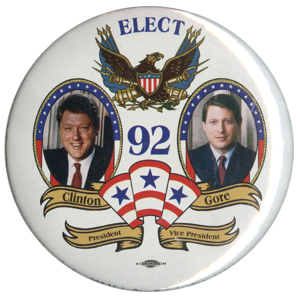 - "Elect 92 Clinton Gore President Vice President", Political Buttons Collection, University of Idaho Library Digital Collections, https://www.lib.uidaho.edu/digital/buttons/items/mg660_box4_3_1397.html