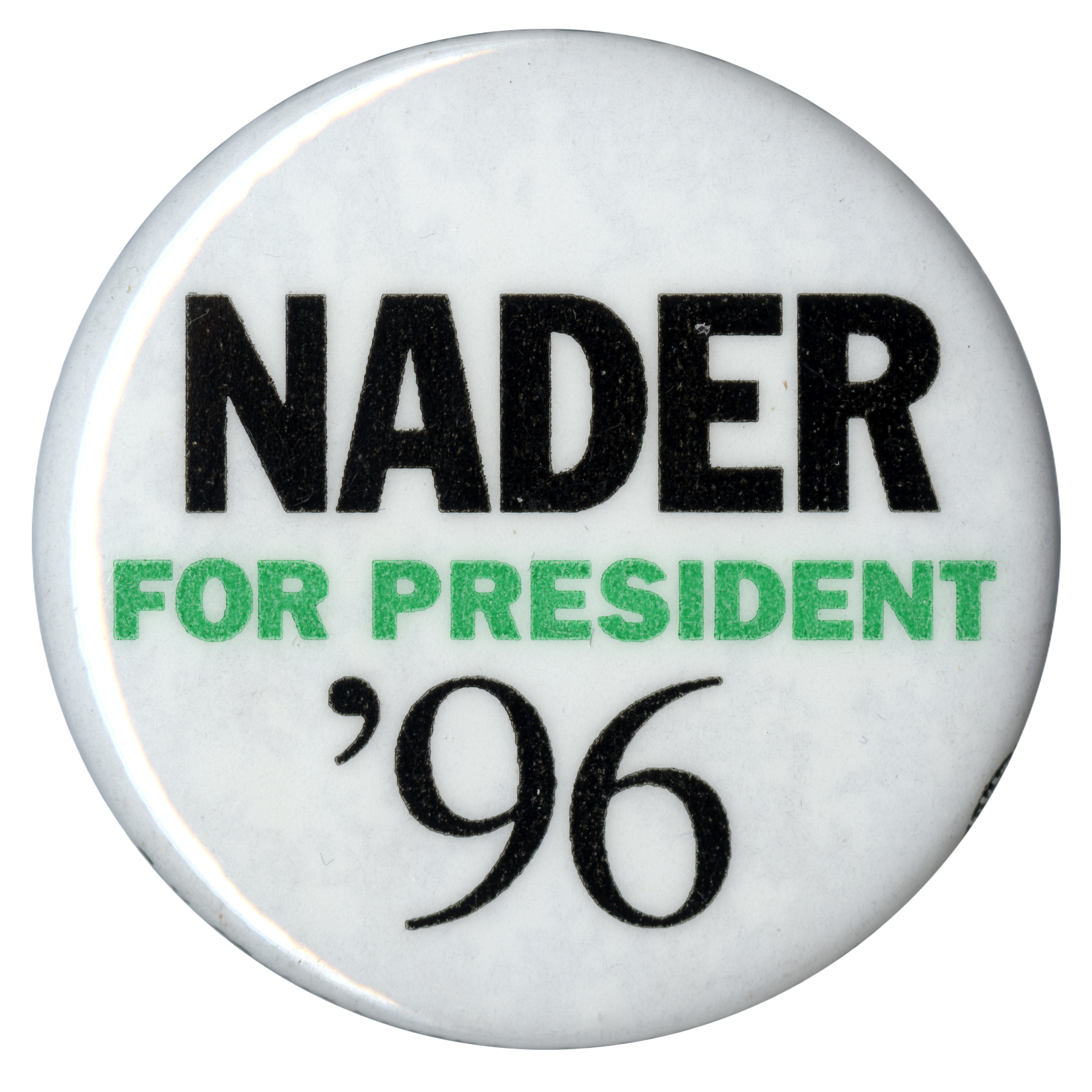 - "Nader for President '96", Political Buttons Collection, University of Idaho Library Digital Collections, https://www.lib.uidaho.edu/digital/buttons/items/mg660_box4_5_1447.html