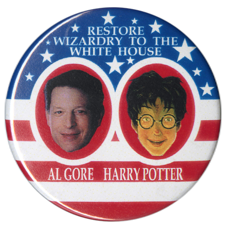 - "Restore Wizardry to the White House Al Gore Harry Potter", Political Buttons Collection, University of Idaho Library Digital Collections, https://www.lib.uidaho.edu/digital/buttons/items/mg660_box5_3-1705.html
