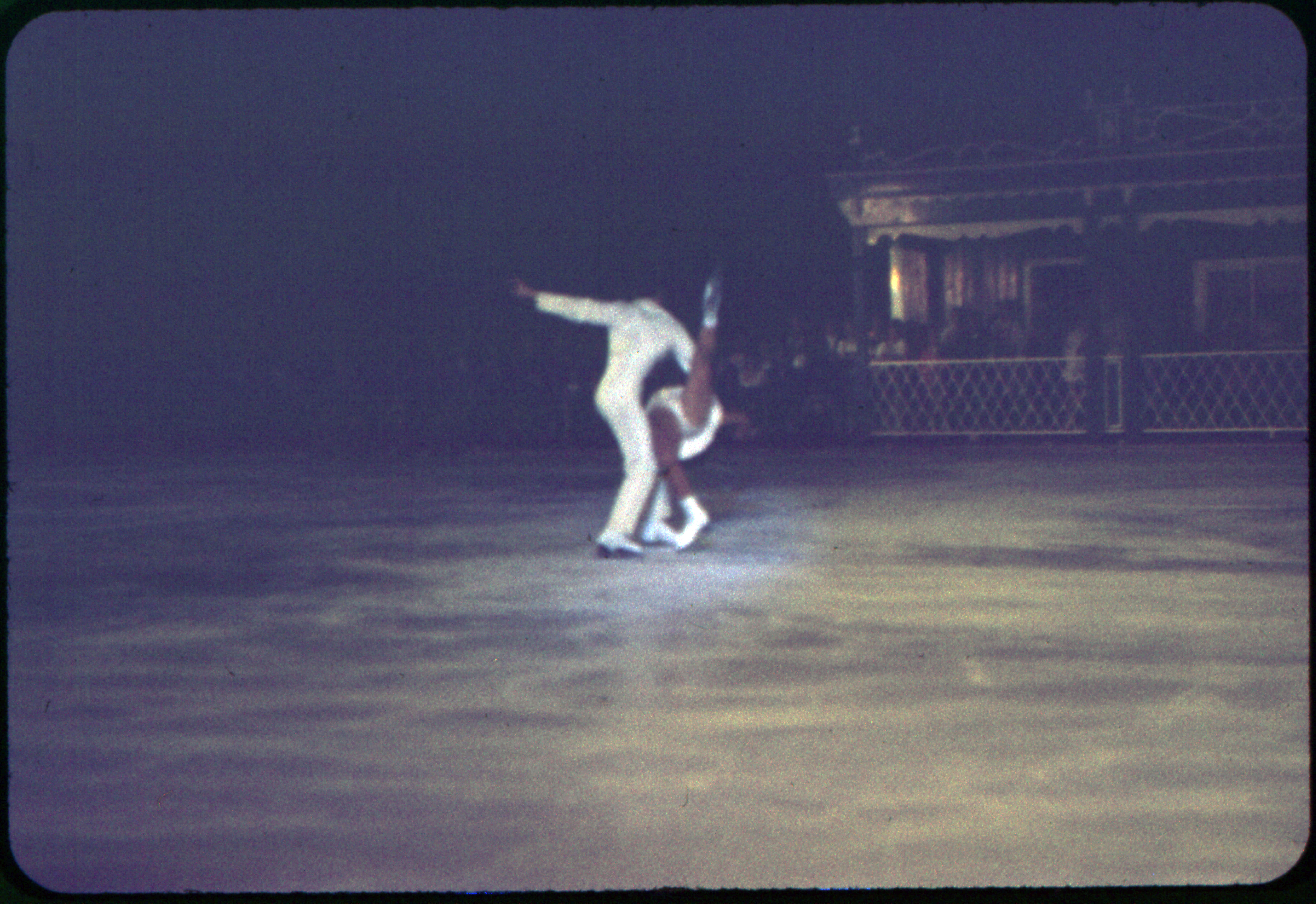 - A photographic slide of a man in a white suit dipping an woman in a ice skating dance. There is a crowd in the background.