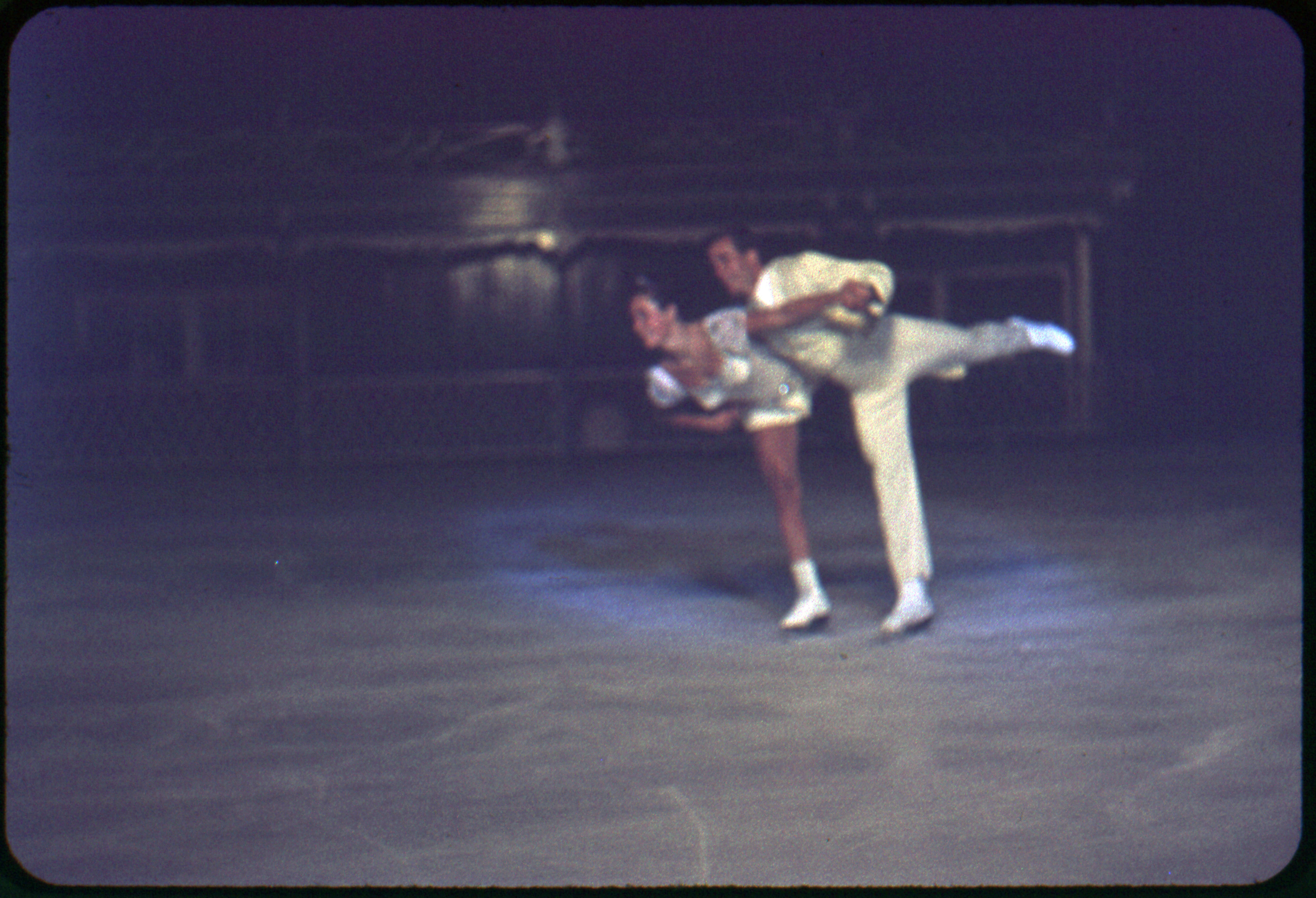 - A photographic slide of a couple ice skating hand in hand and both on one leg. They are in a white costume and there are people in the background.