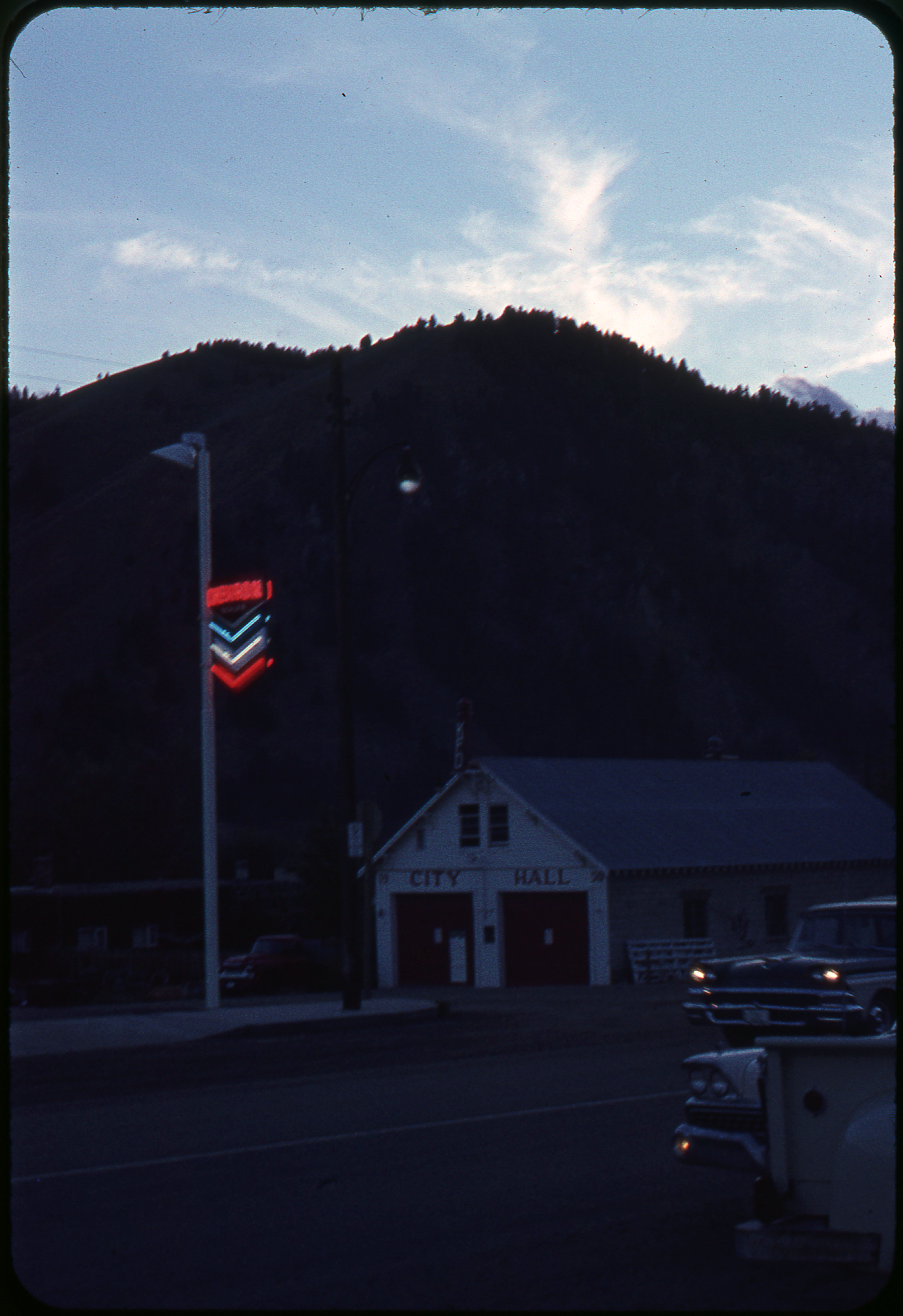 - A photographic slide of a city hall building in front of a mountain. There are cars driving on the road nearby.