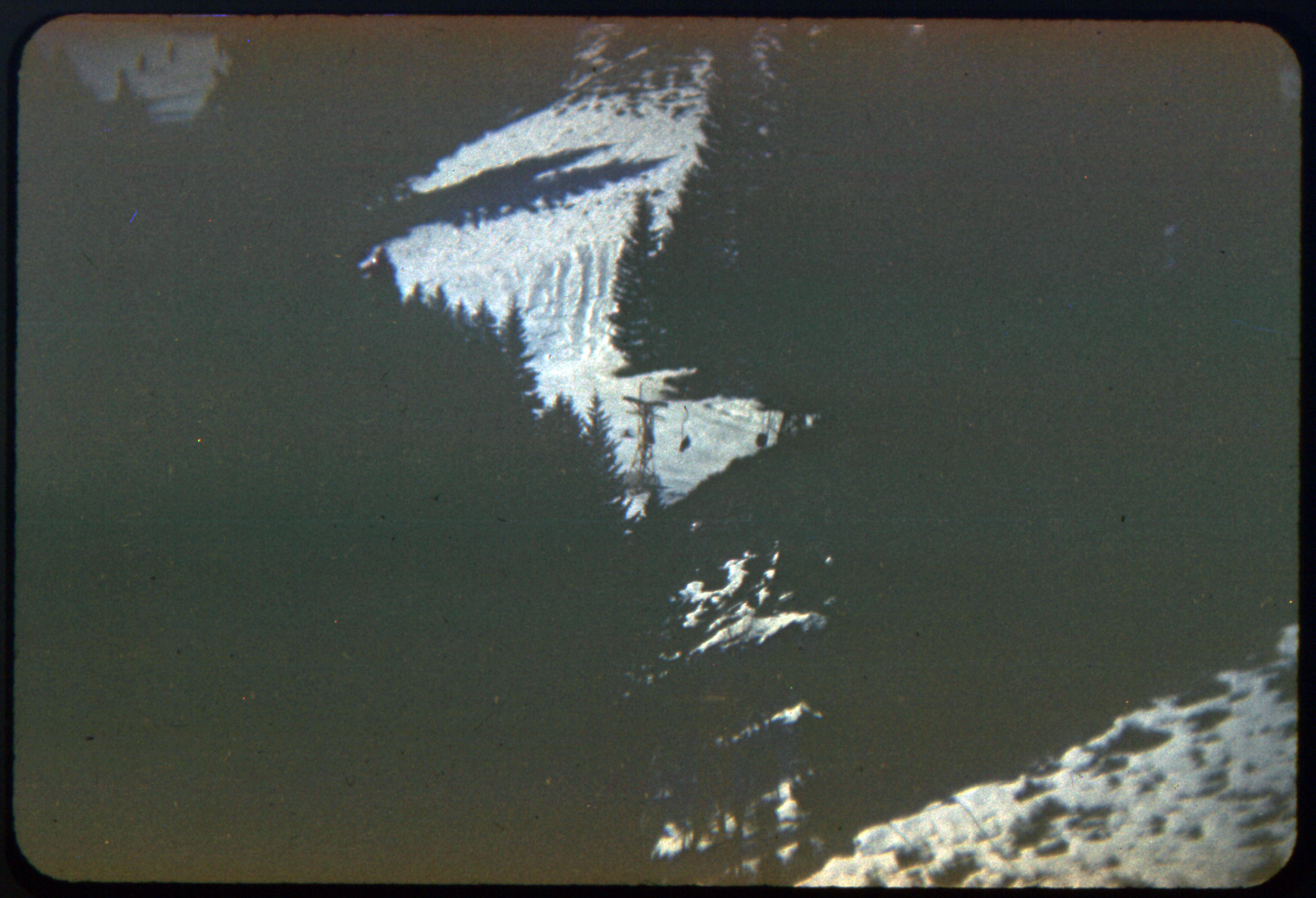 - A photographic slide of a snowy mountain range. There is a chairlift slightly visible.