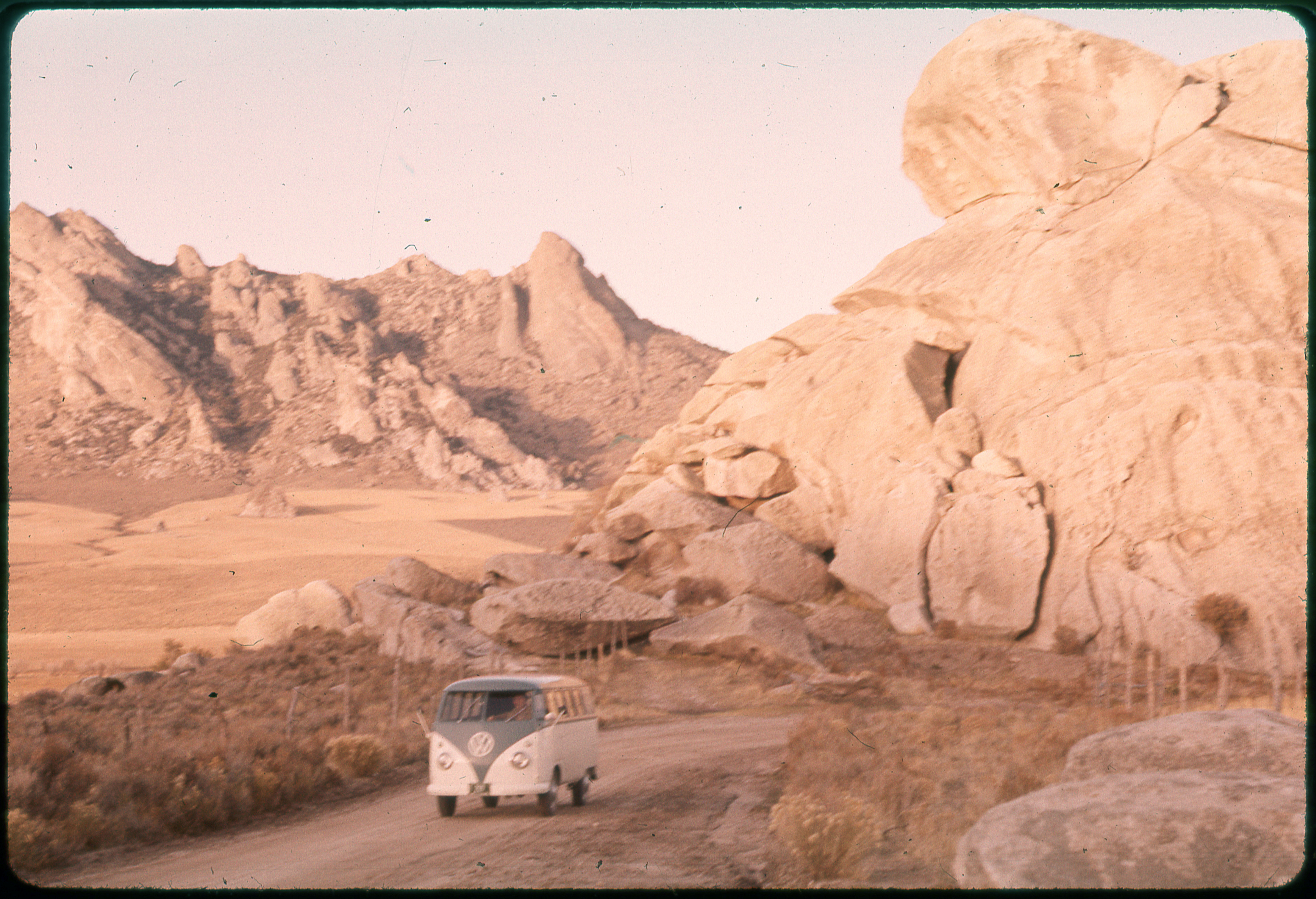 - A photographic slide of A VW van driving along a dirt road. There are many rocky formations behind it and mountains.