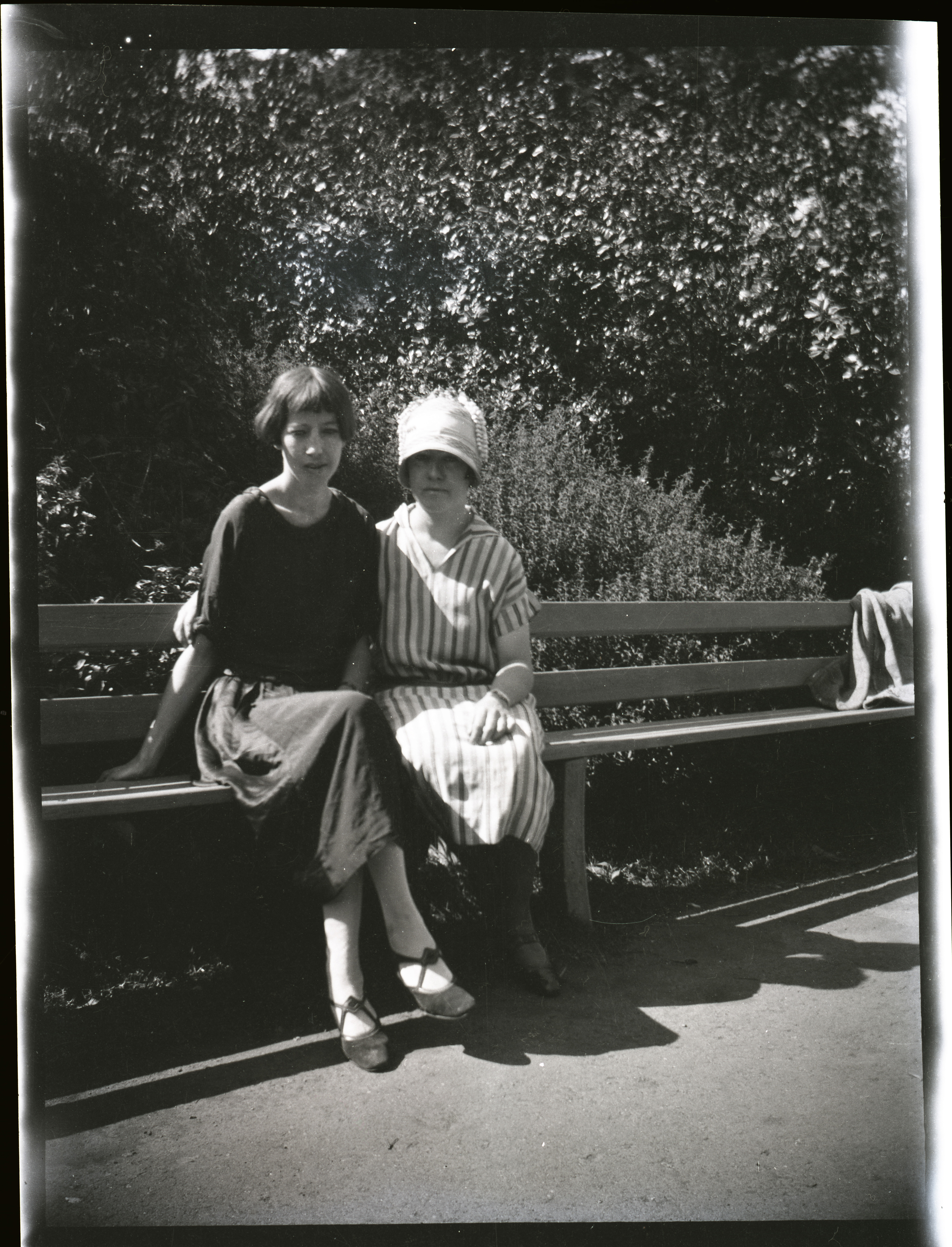 - A black and white negative of two women sitting on a bench in an outdoor park area. the women are wearing dresses and one is wearing a hat.