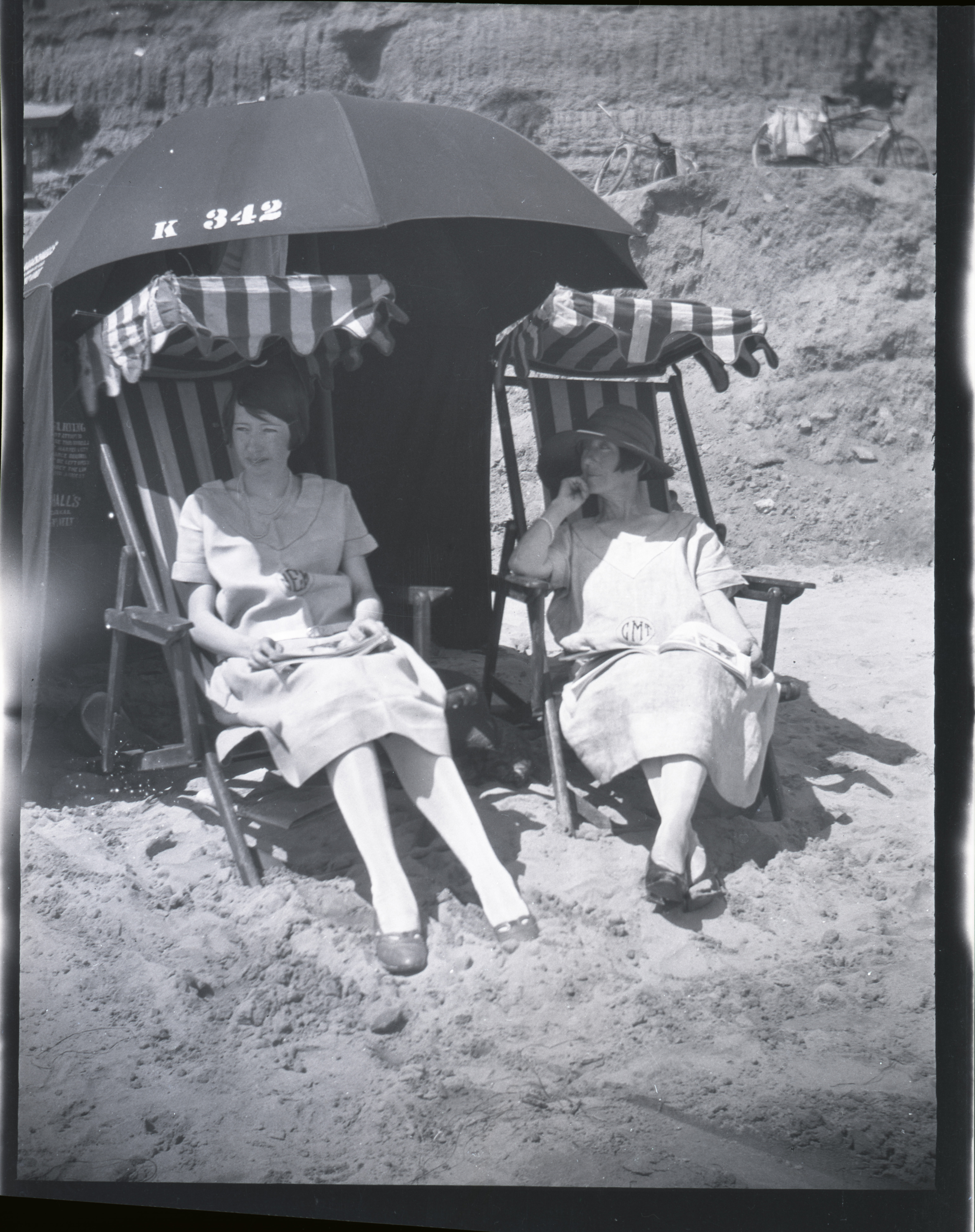 - A black and white negative of two women sitting under striped umbrellas on the beach. There are bikes in the background on a rock formation.