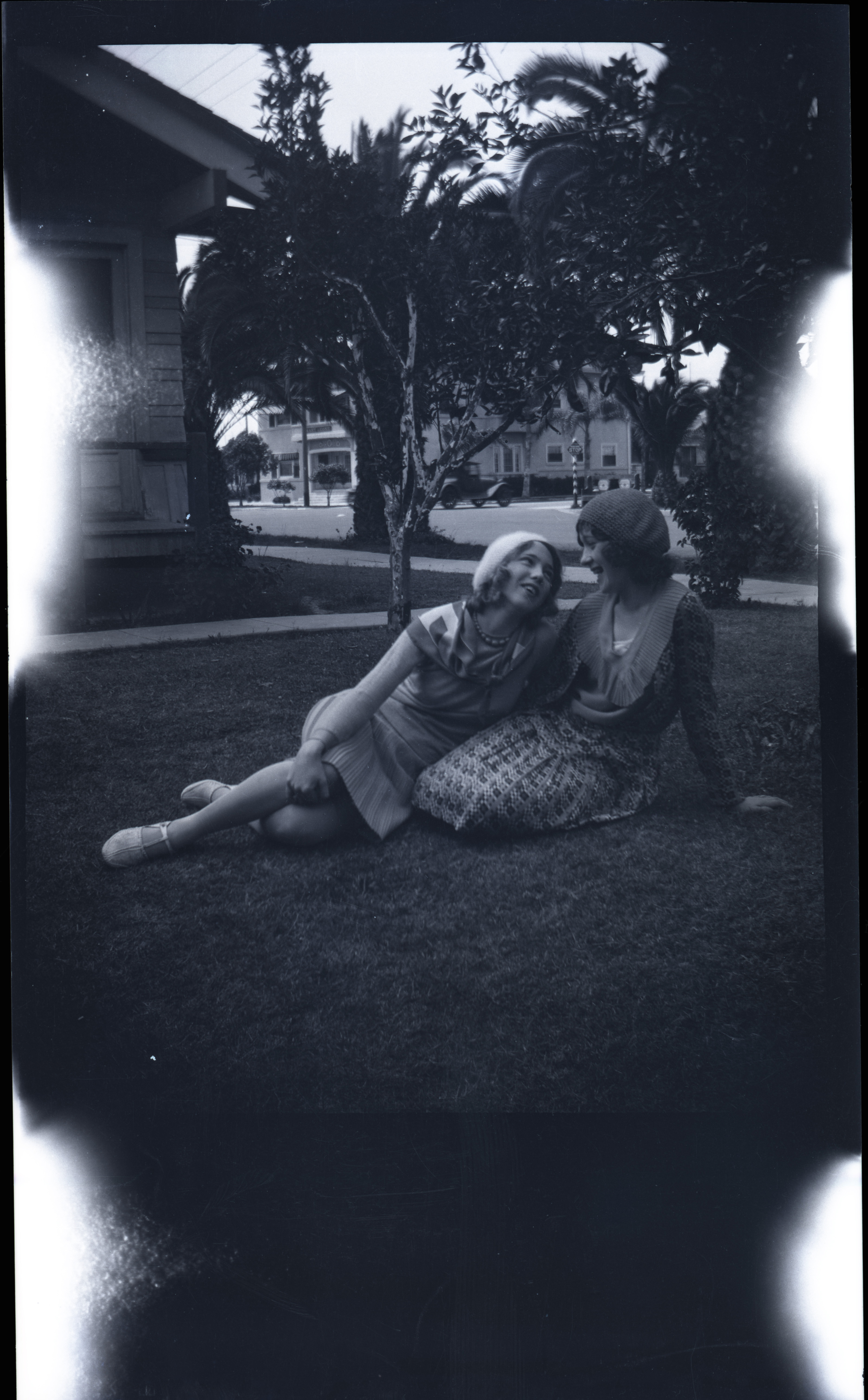- A black and white negative of two women sitting together laughing on a lawn out front of a house. The girls are in dresses and there are palm trees and moving car in the background.