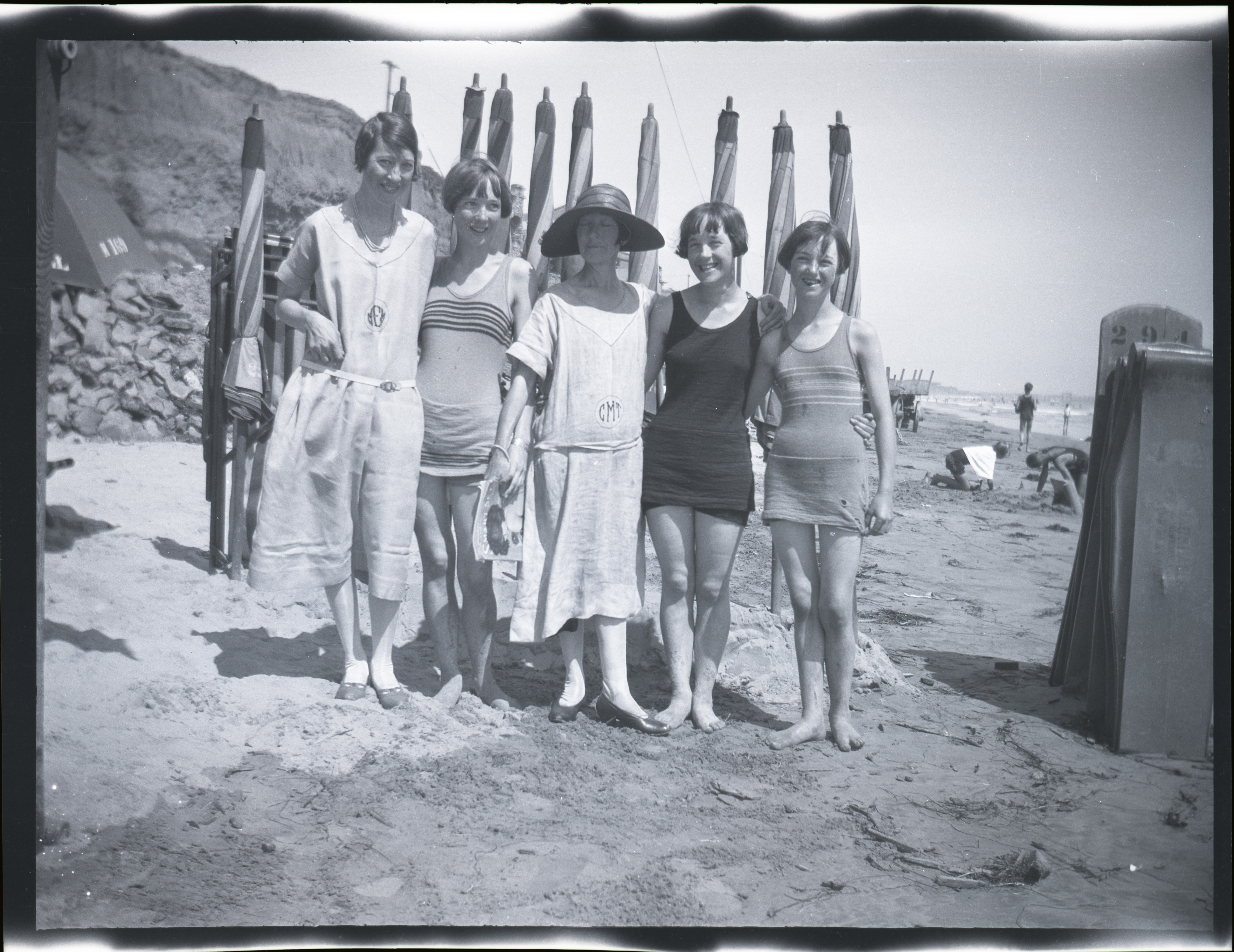 - A black and white negative of five women in bathing suits standing together on the beach. There are folded umbrellas behind them and people on the coastline.