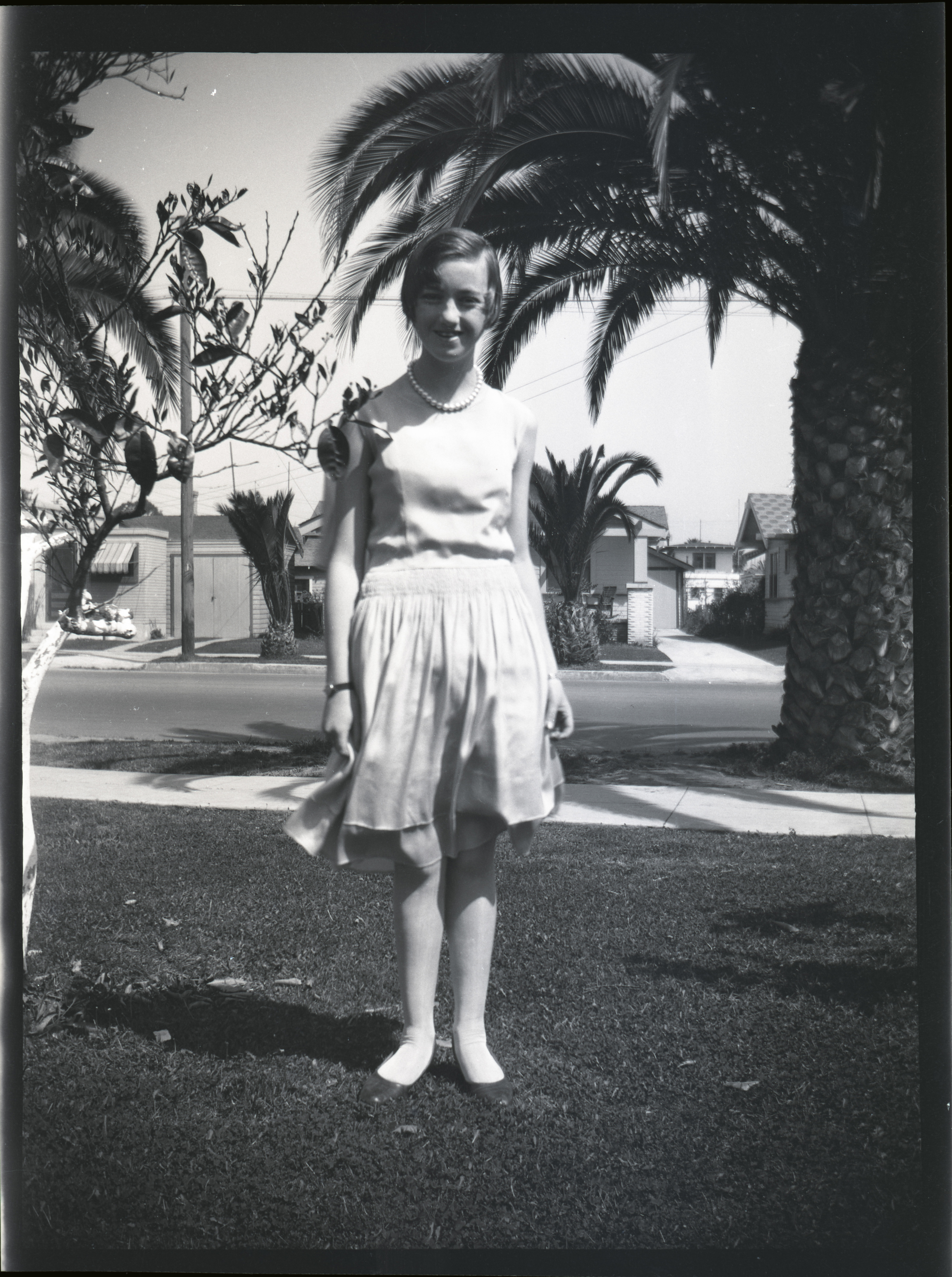 - A black and white negative of Evelyn Crabtree as young girl. She is standing on her front lawn in a nice dress and pearls. There are palm trees and a neighborhood in the background.