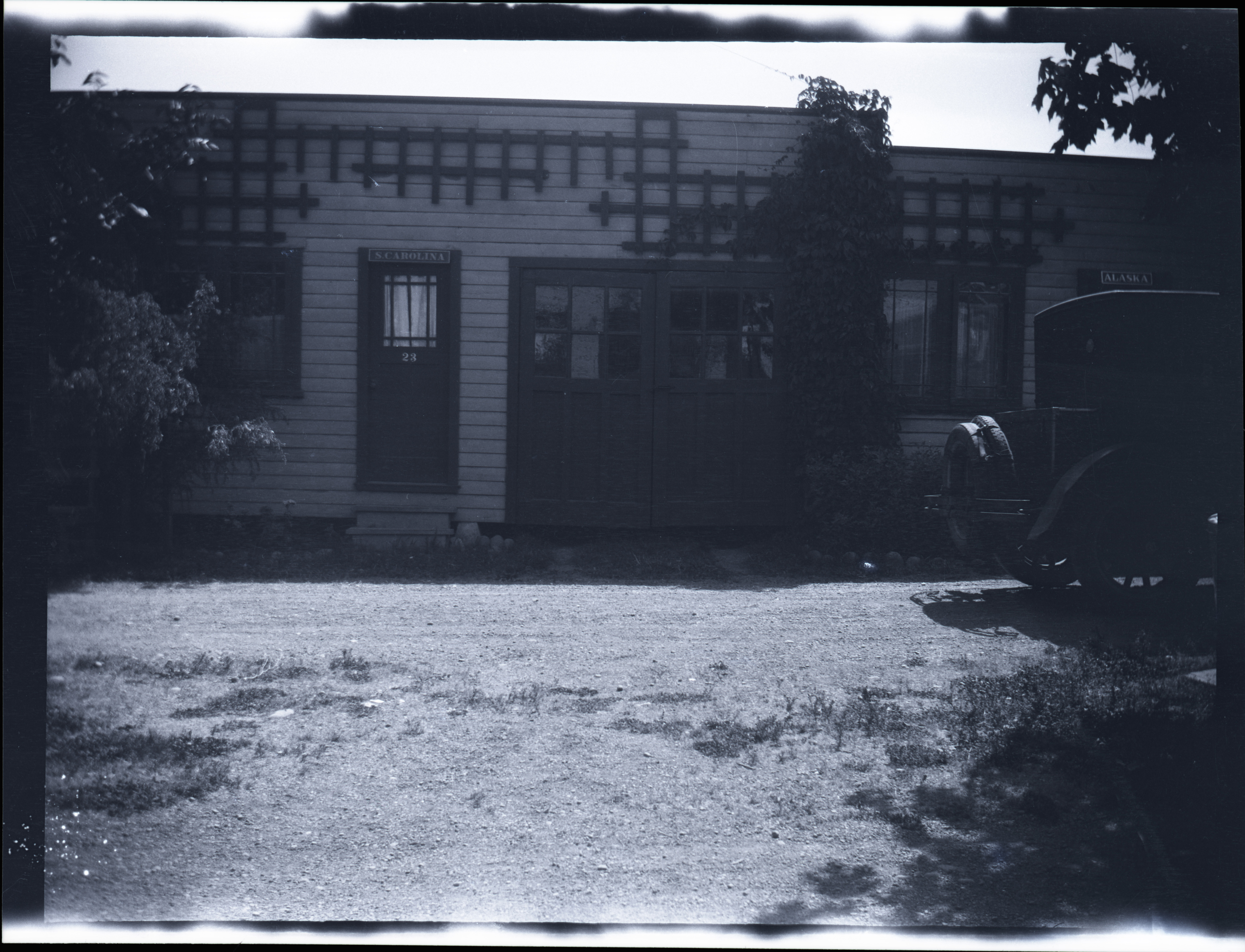 - A black and white negative of a building with the label S Carolina 23 above the door. There is part of a car in the photo.