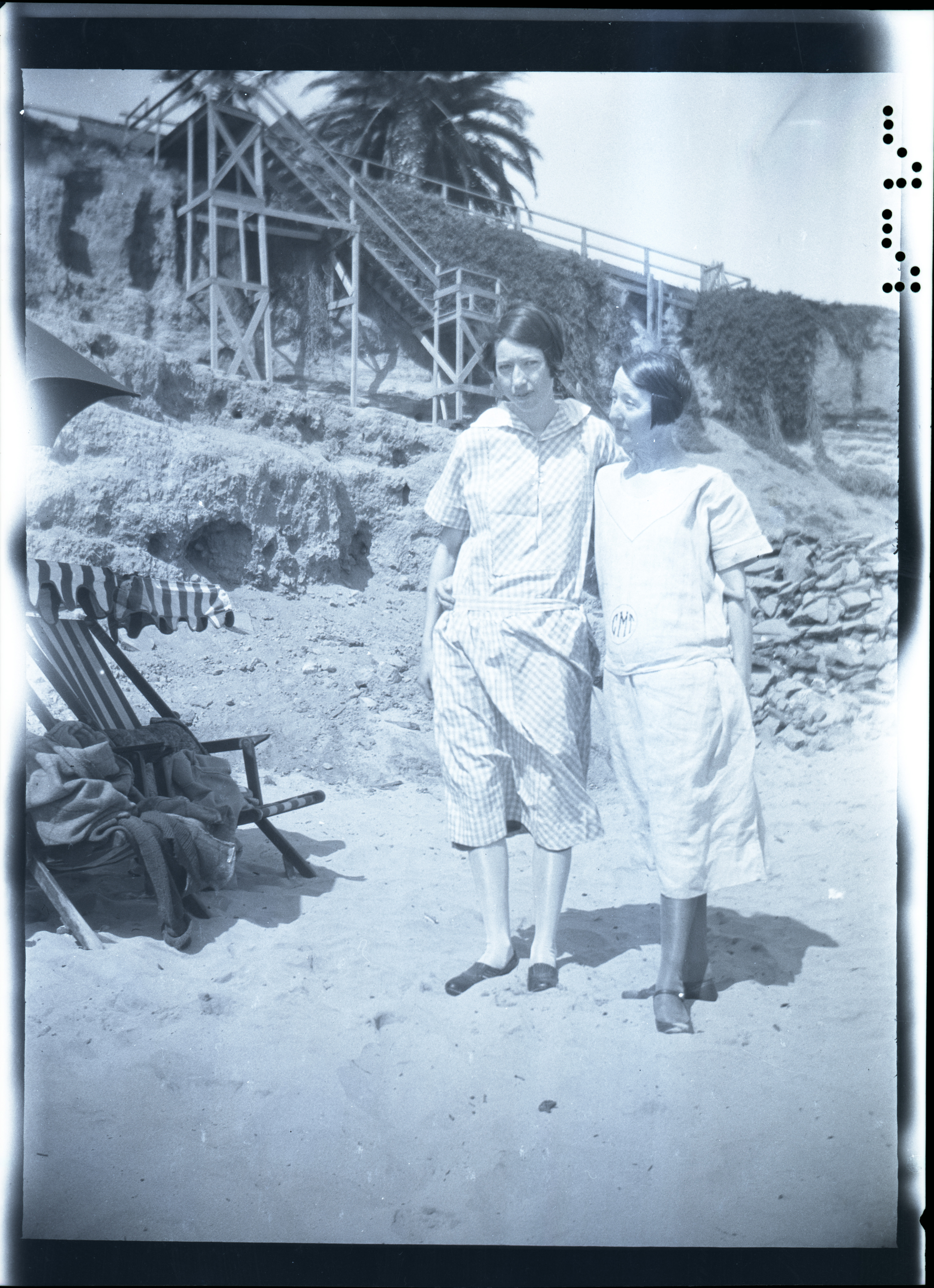 - A black and white negative of two women standing together on the beach. There is a large staircase and beach chairs in the background. The women are wearing frocks.