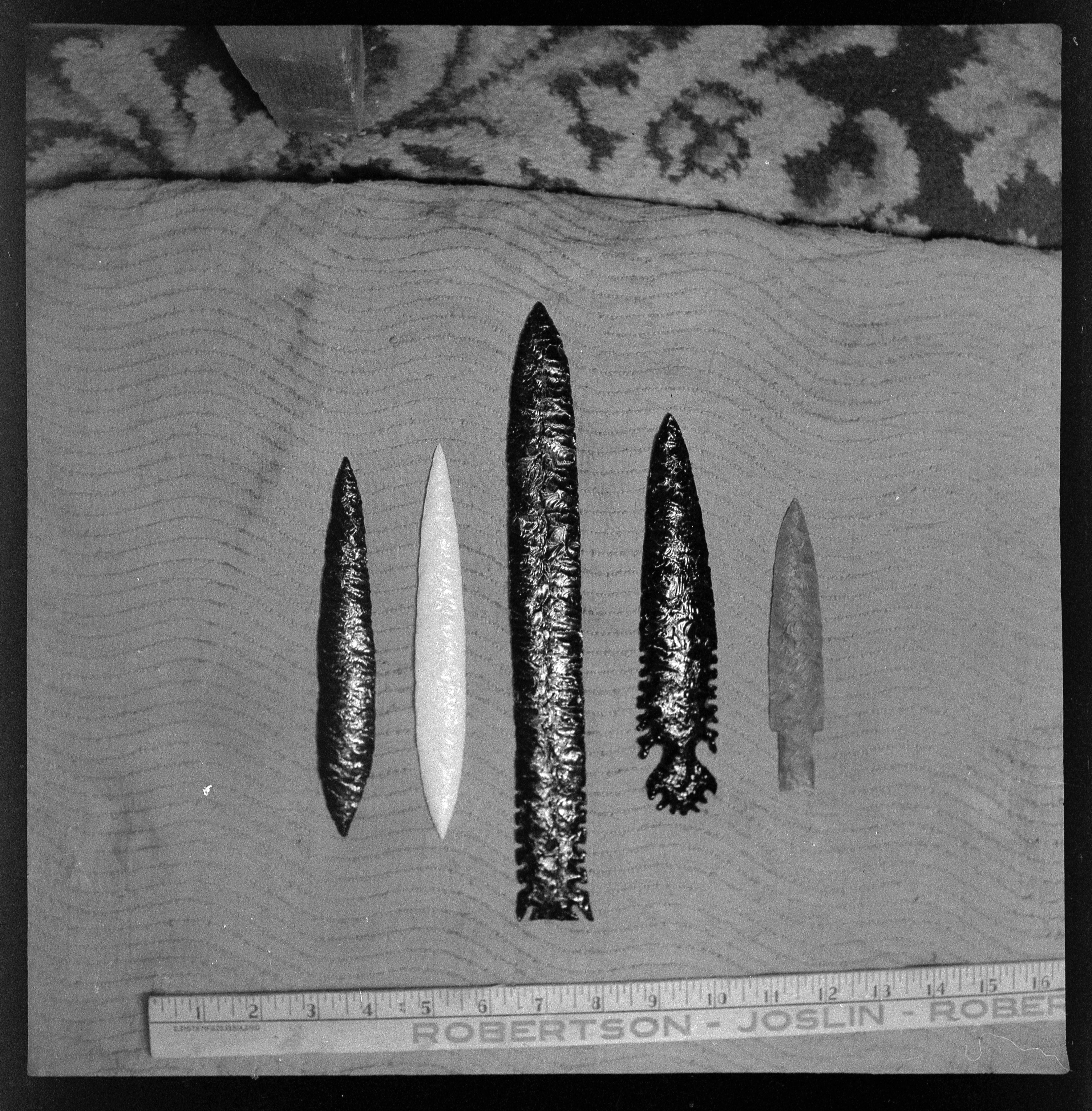 - A black and white negative of five bifaces with a yardstick in the photo for reference. There are three black bifaces, one white, and one grey looking one, dependent on the coloring of the photo.