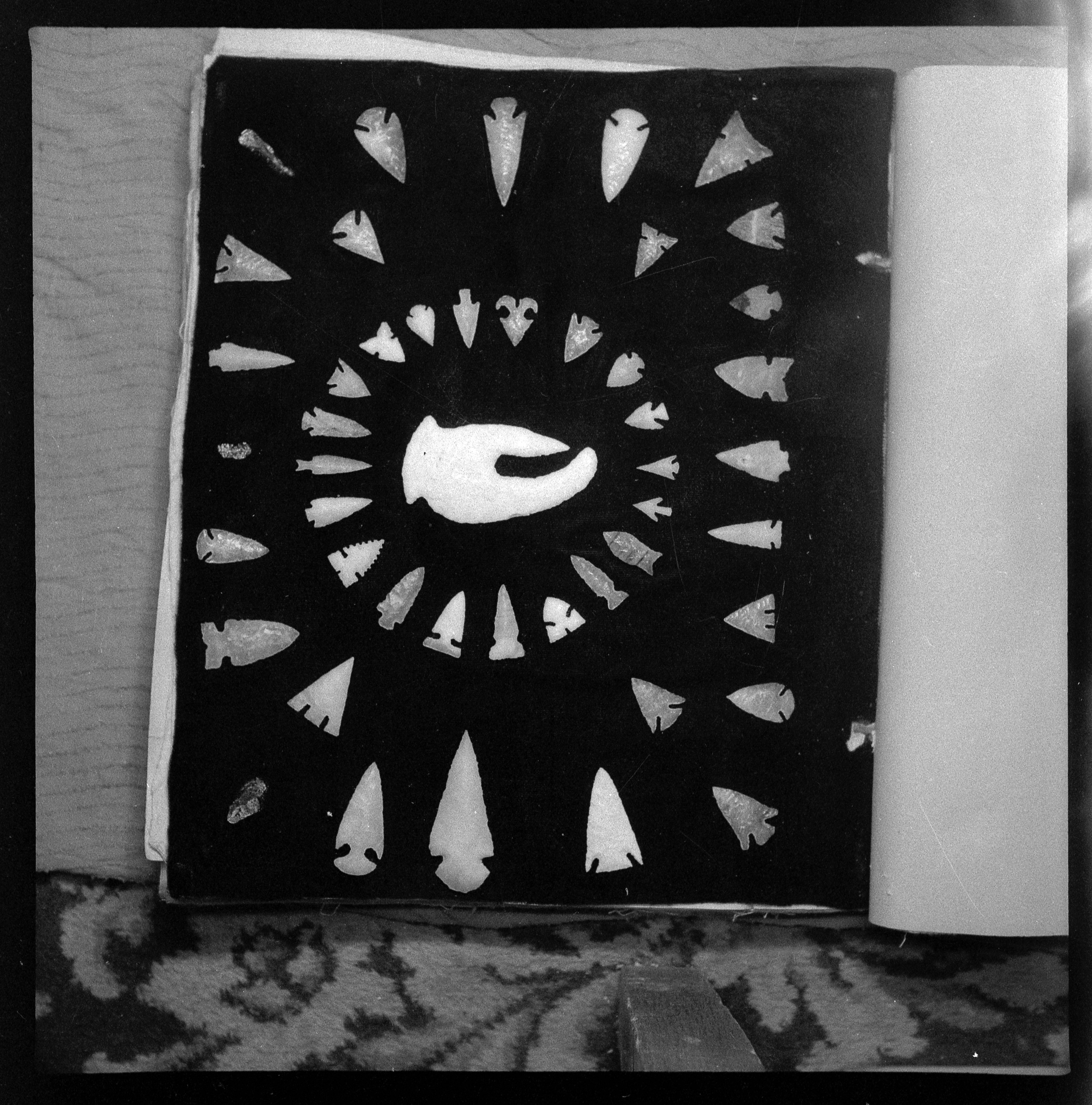 - A black and white negative with many bifaces, varying in size, color and style organized in a circle around a large central biface that looks similar to a crab claw.