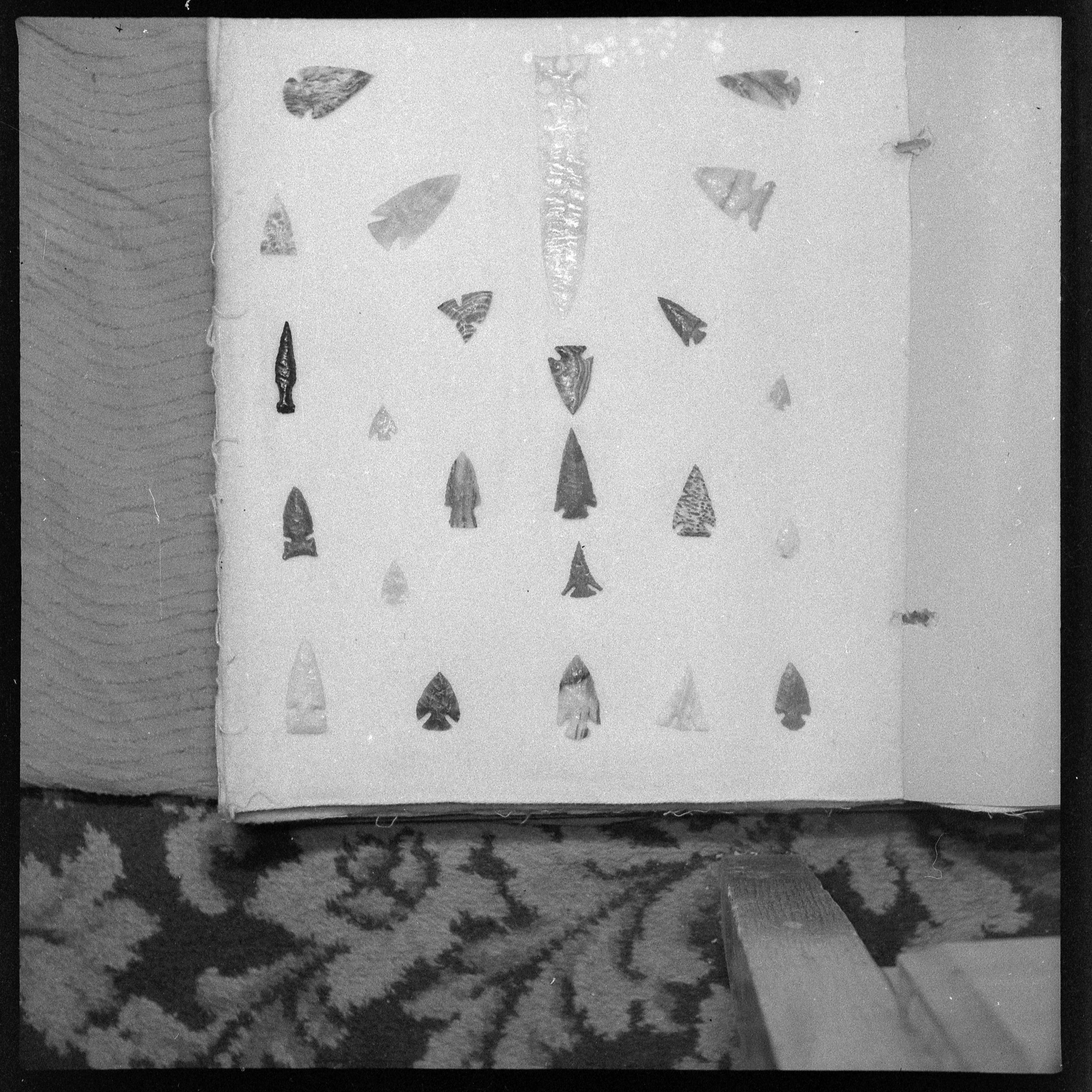 - A black and white negative of eccentric stone tool items. There are different bifaces arranged neatly on white pages. They are all unique, detailed, and of different stone materials.