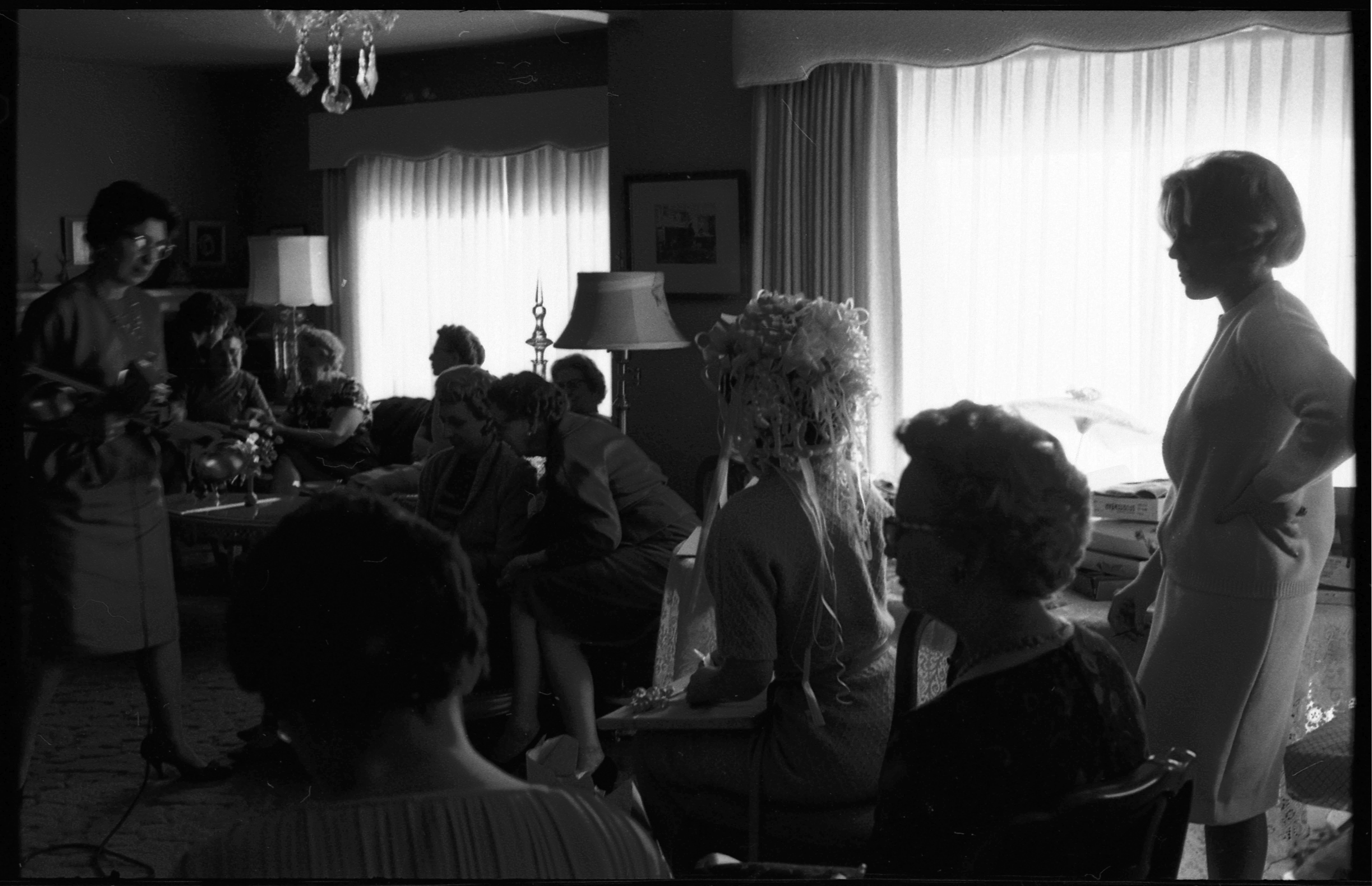 - A photo of a group of women gathered in a sitting room. The woman sitting in the center foreground is holding a gift and has a hat of ribbons and bows in her hair. The event appears to be a bridal shower. Associated with item numbers: ce_b83_f1-item1-001 through ce_b83_f1-item1-016.