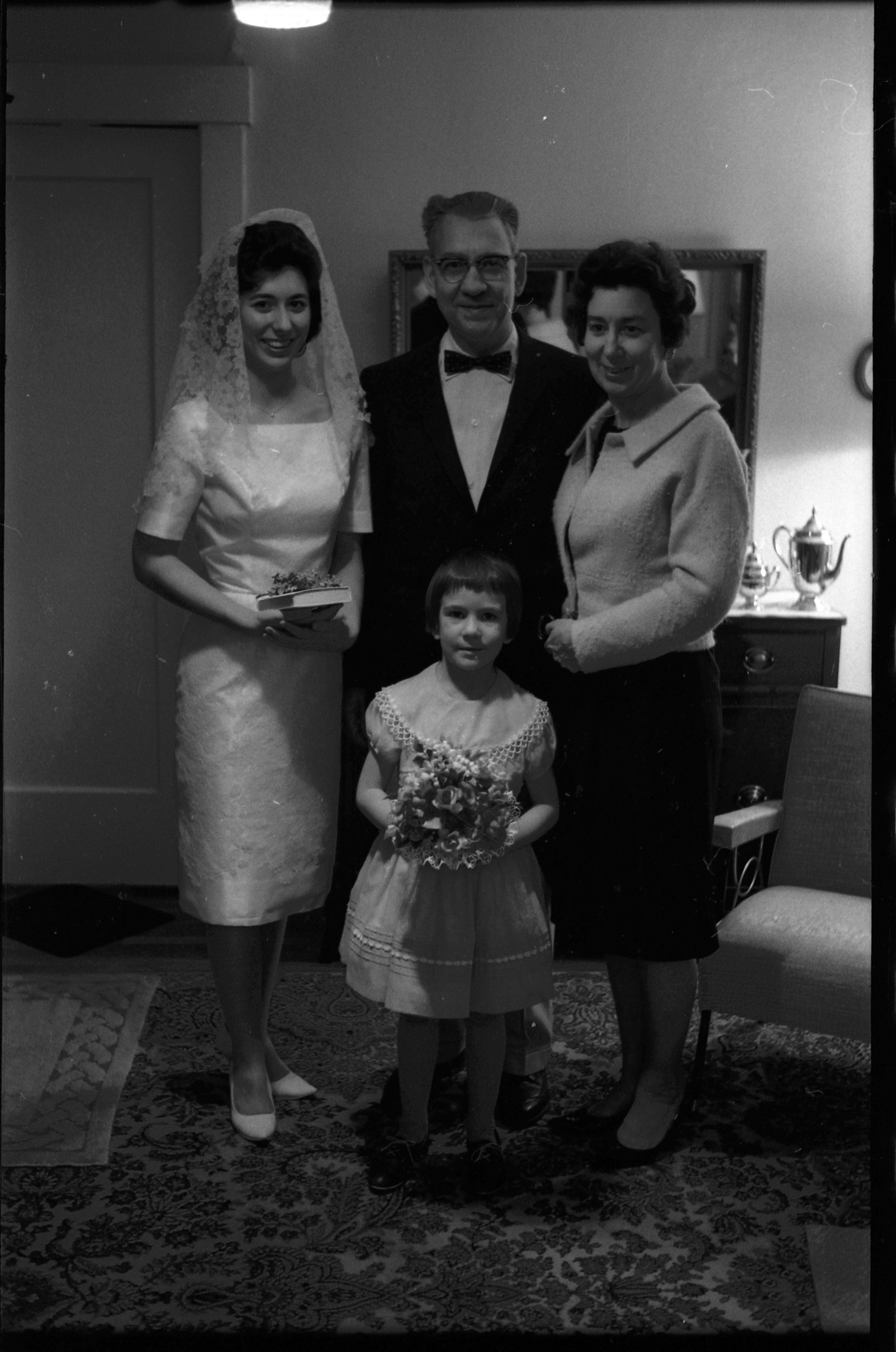 - A photo of four people, including a woman wearing a wedding dress and a child, posing for the camera. The woman is holding a book and the child is holding a small bouquet of flowers. Associated with item numbers: ce_b83_f1-item1-017 through ce_b83_f1-item1-036.