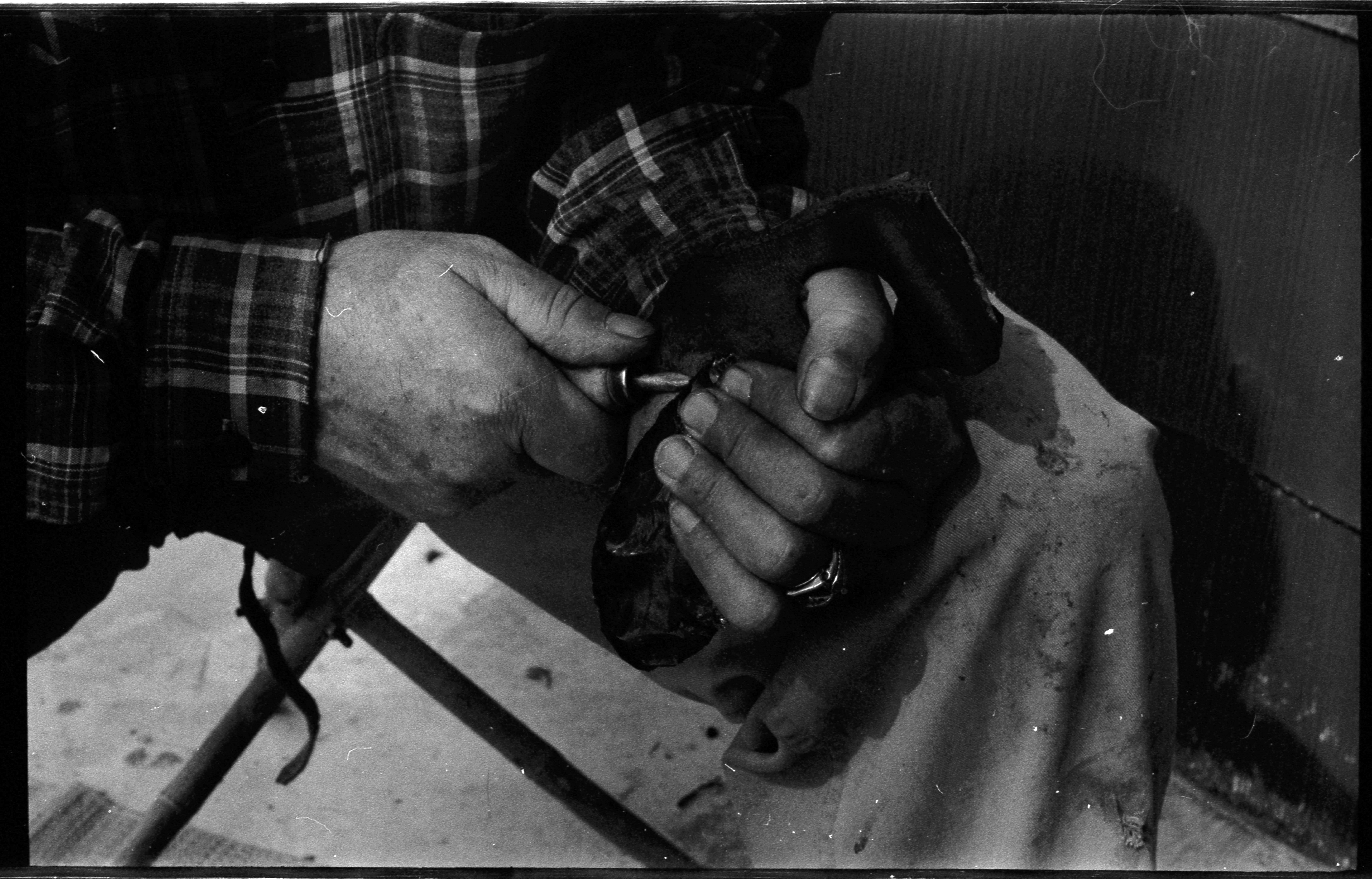 - A photo of pair of hands, holding a stone and actively flintknapping. Associated with item numbers: ce_b83_f2-item1-004 through ce_b83_f2-item1-024.