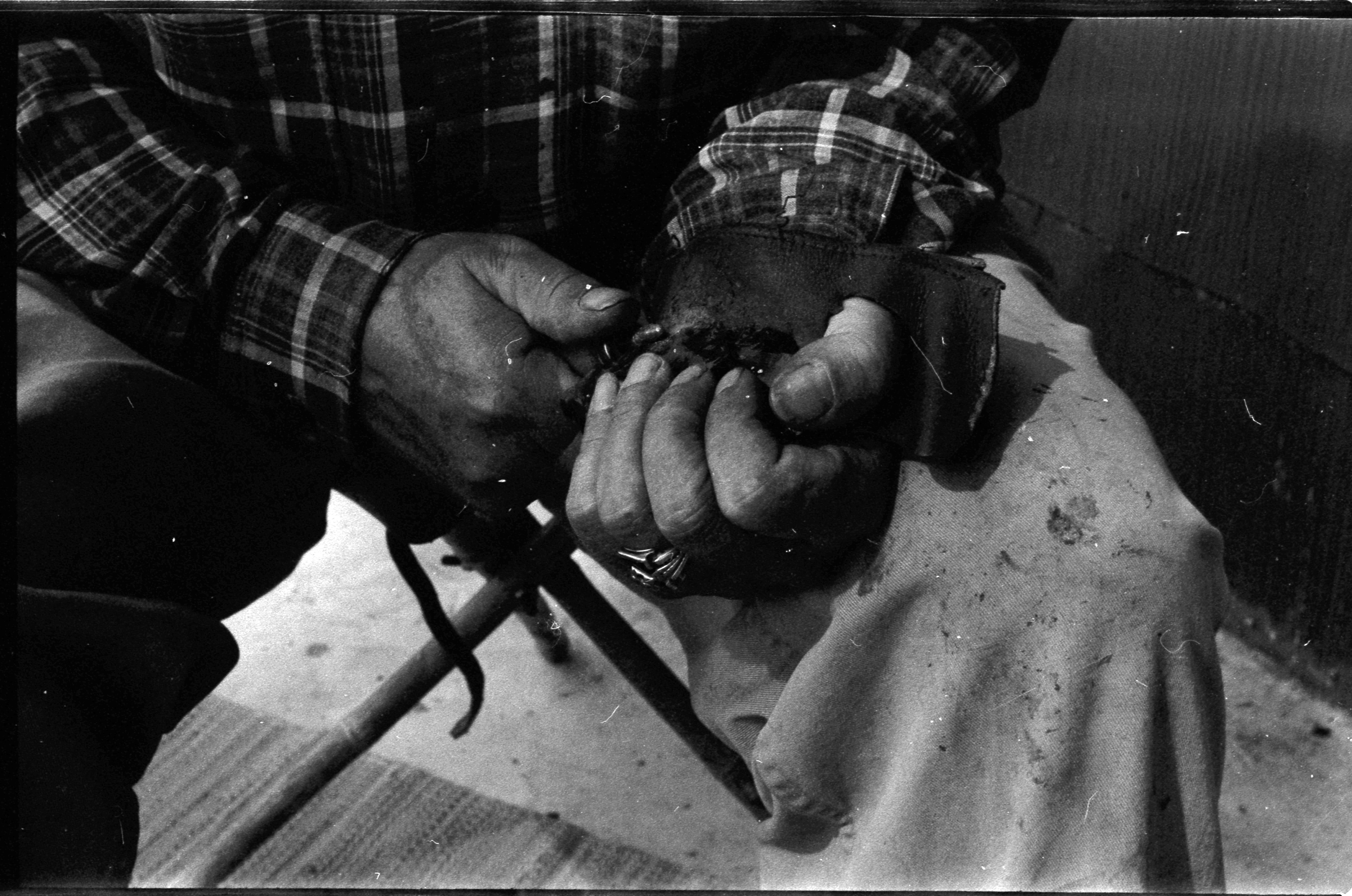 - A photo of pair of hands, holding a stone and actively flintknapping. Associated with item numbers: ce_b83_f2-item1-004 through ce_b83_f2-item1-024.