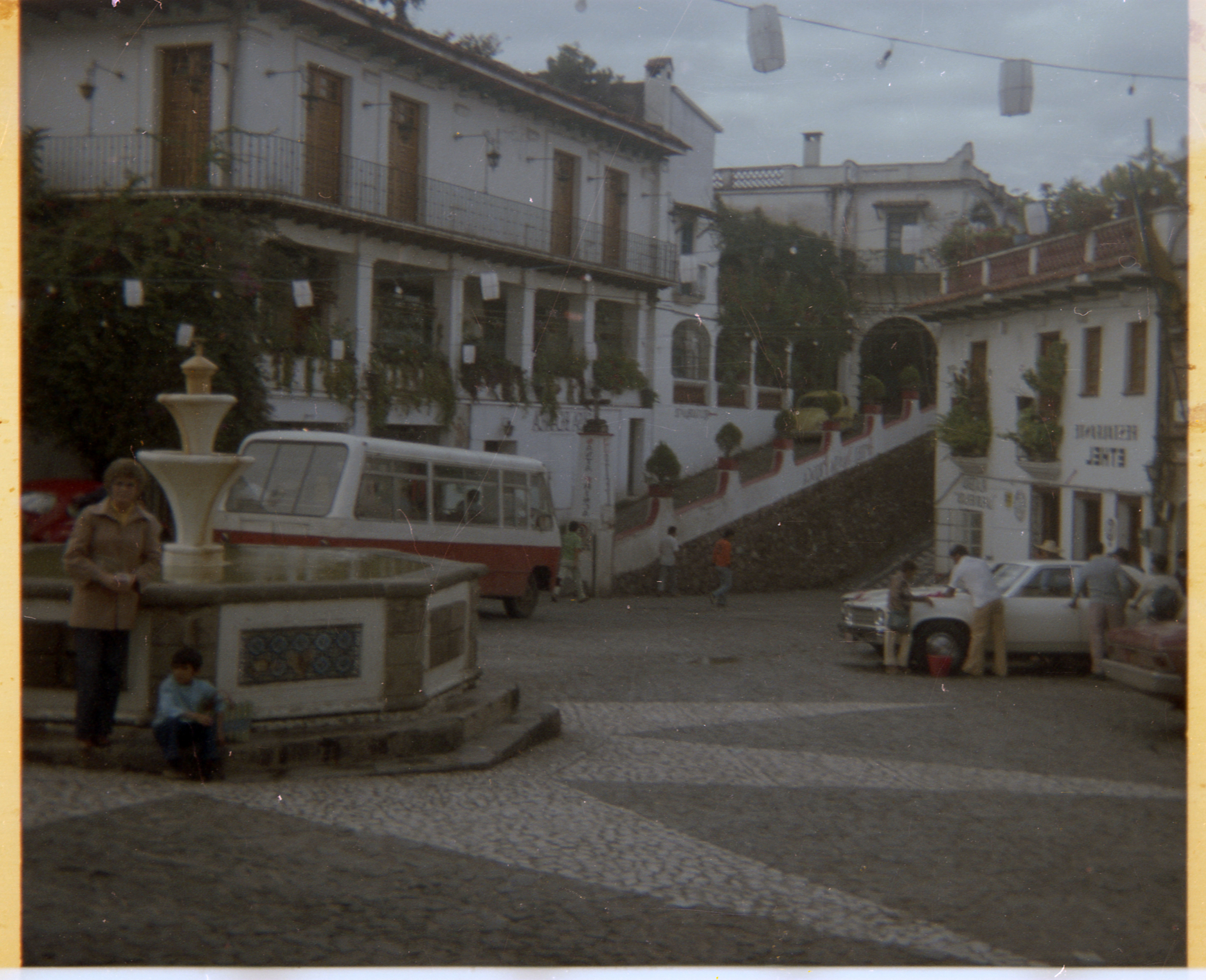 - A photograph of Evelyn Crabtree posing next to a fountain in a city square. A young, unnamed child, is sitting in front of the fountain.