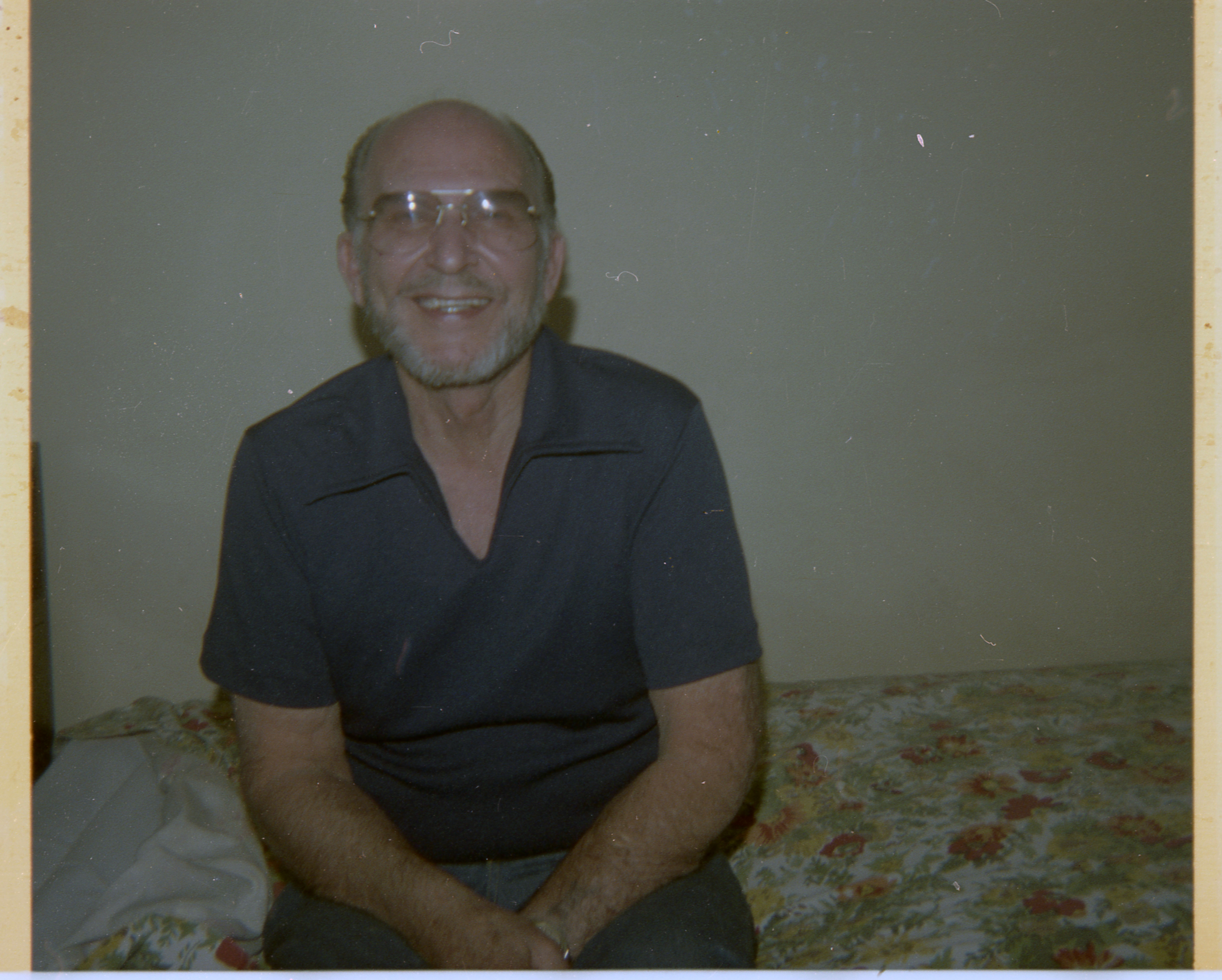 - A photograph of Donald Crabtree sitting on a bed, smiling.