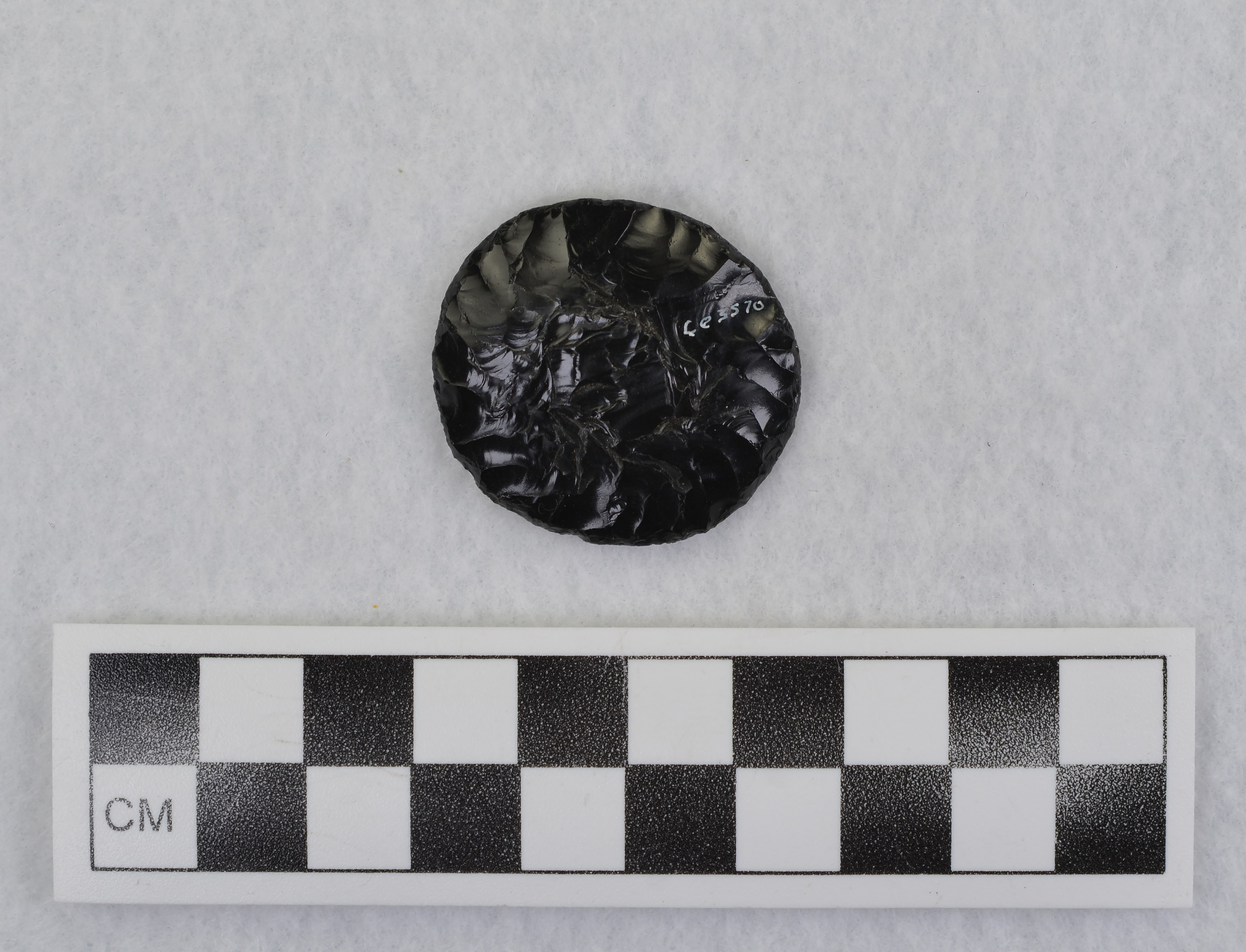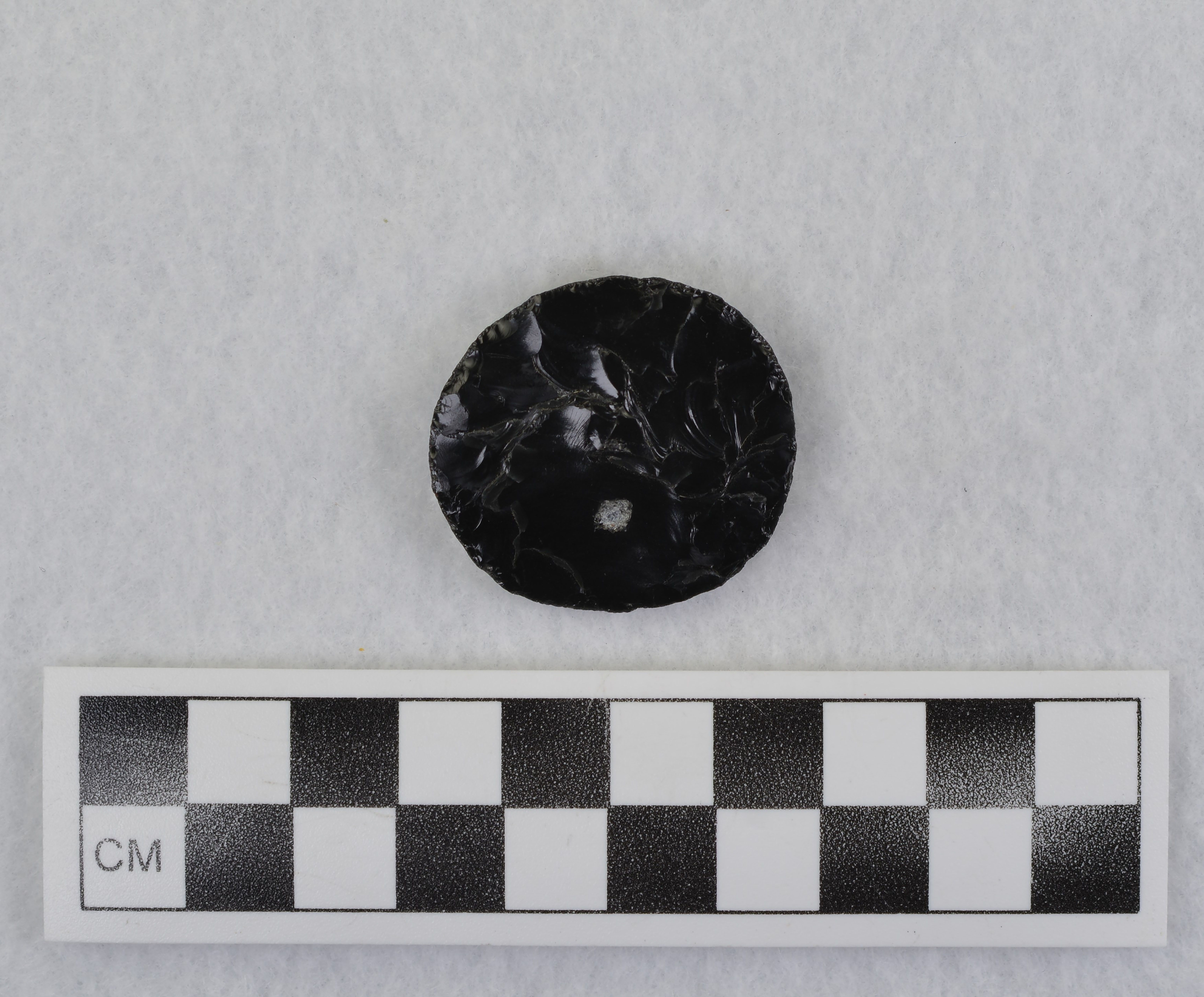 - Spheroid/plano-convex indentation on plano side, "Due to pecking from tool engraver (electric). Crabtree was probably going to perforate this to be used as a pendant. See Crabtree 1472, pg 31 (cone principal paper). (JW) Tebiwa, Vol. 15, No. 2, 1972, pp. 29-42."