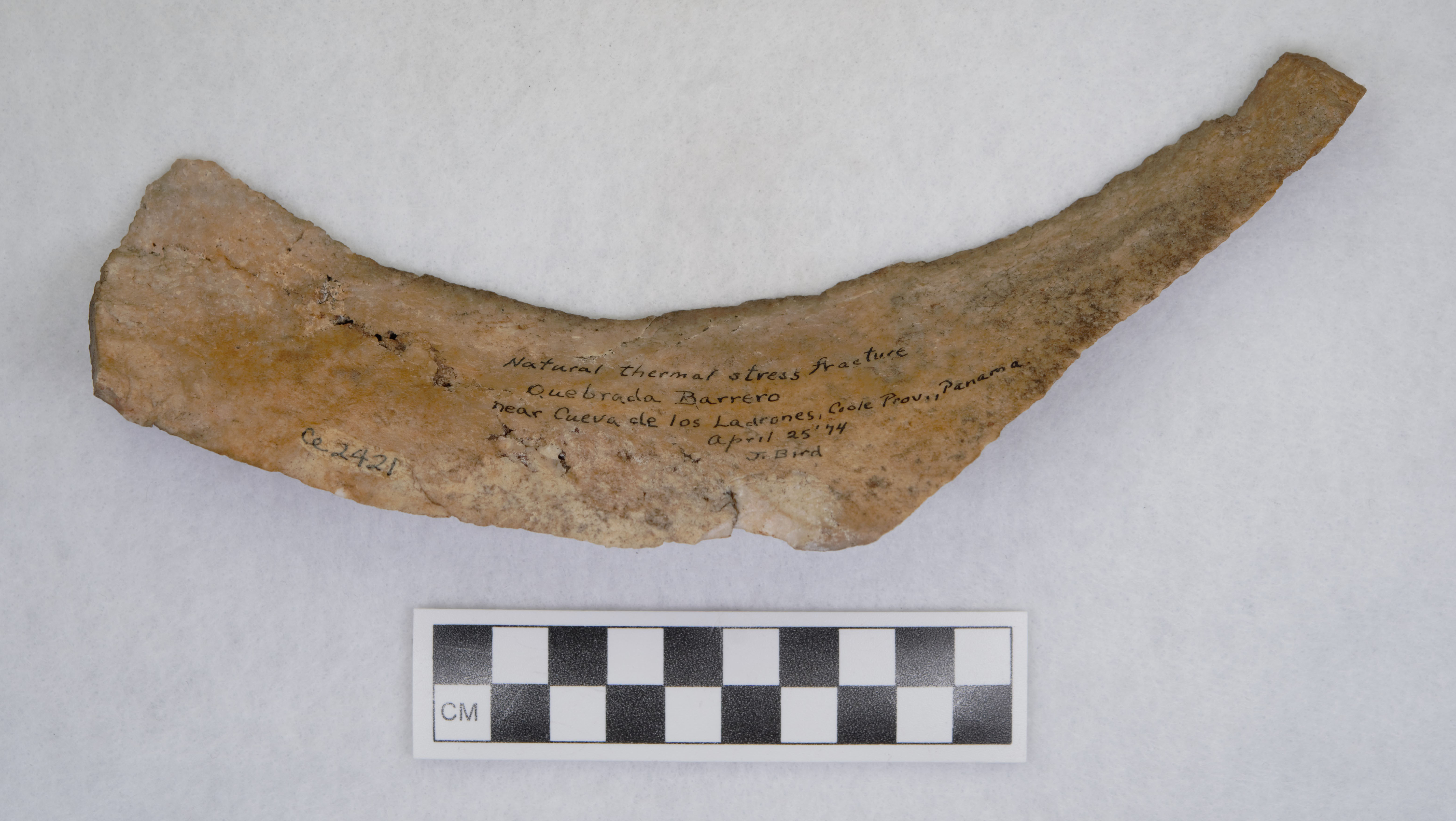 - Natural thermal stress fracture, "Marked on stone: Quebrada Barrero, near Cueva de los Ladrones, Coole Prov., Panama. April 25, 1974. J. Bird. Pictures included (3) put in photo album."