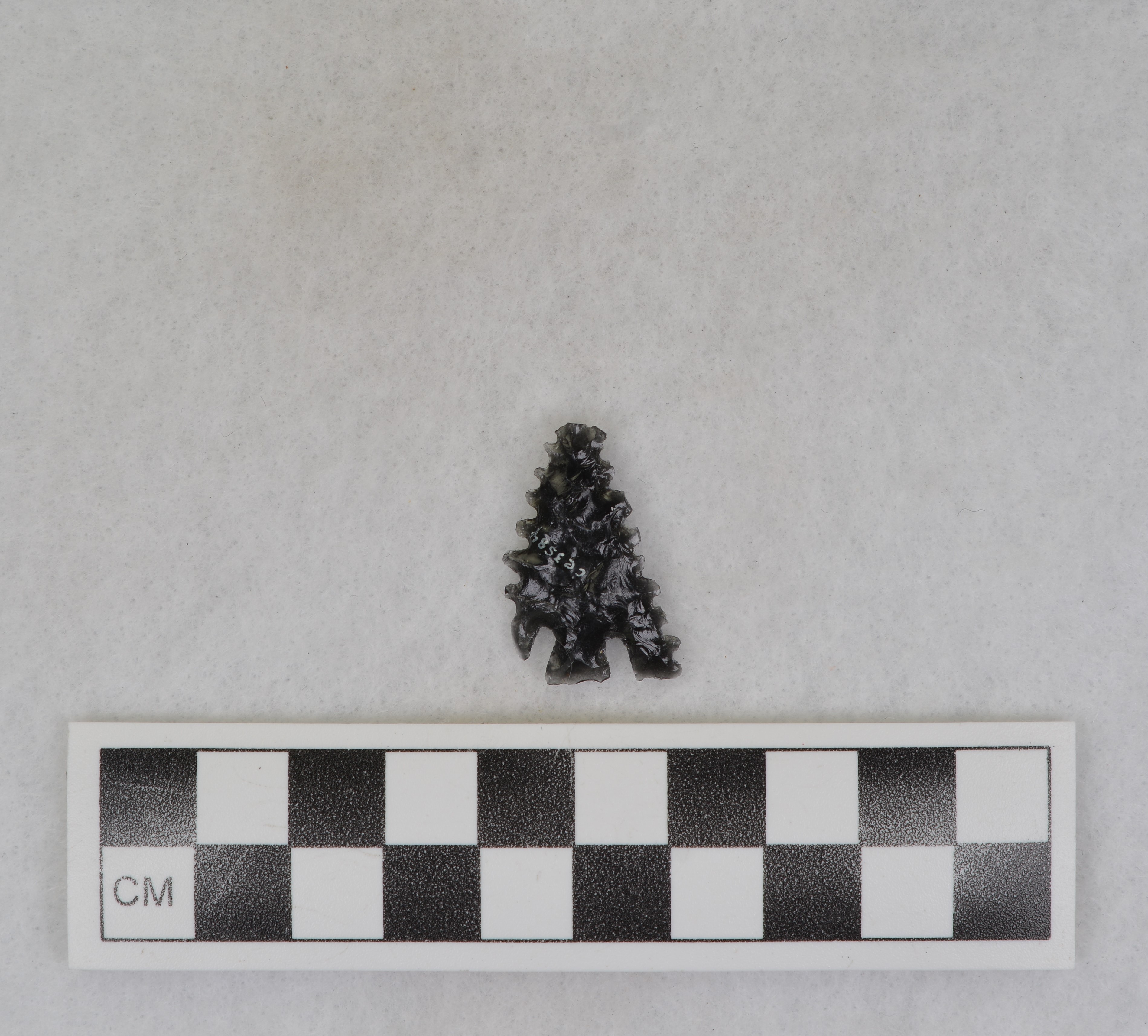 - Basal notched, serrated, 1 tang missing, beautiful serrations, corner notched. Tang broken off during notching process. (GT)