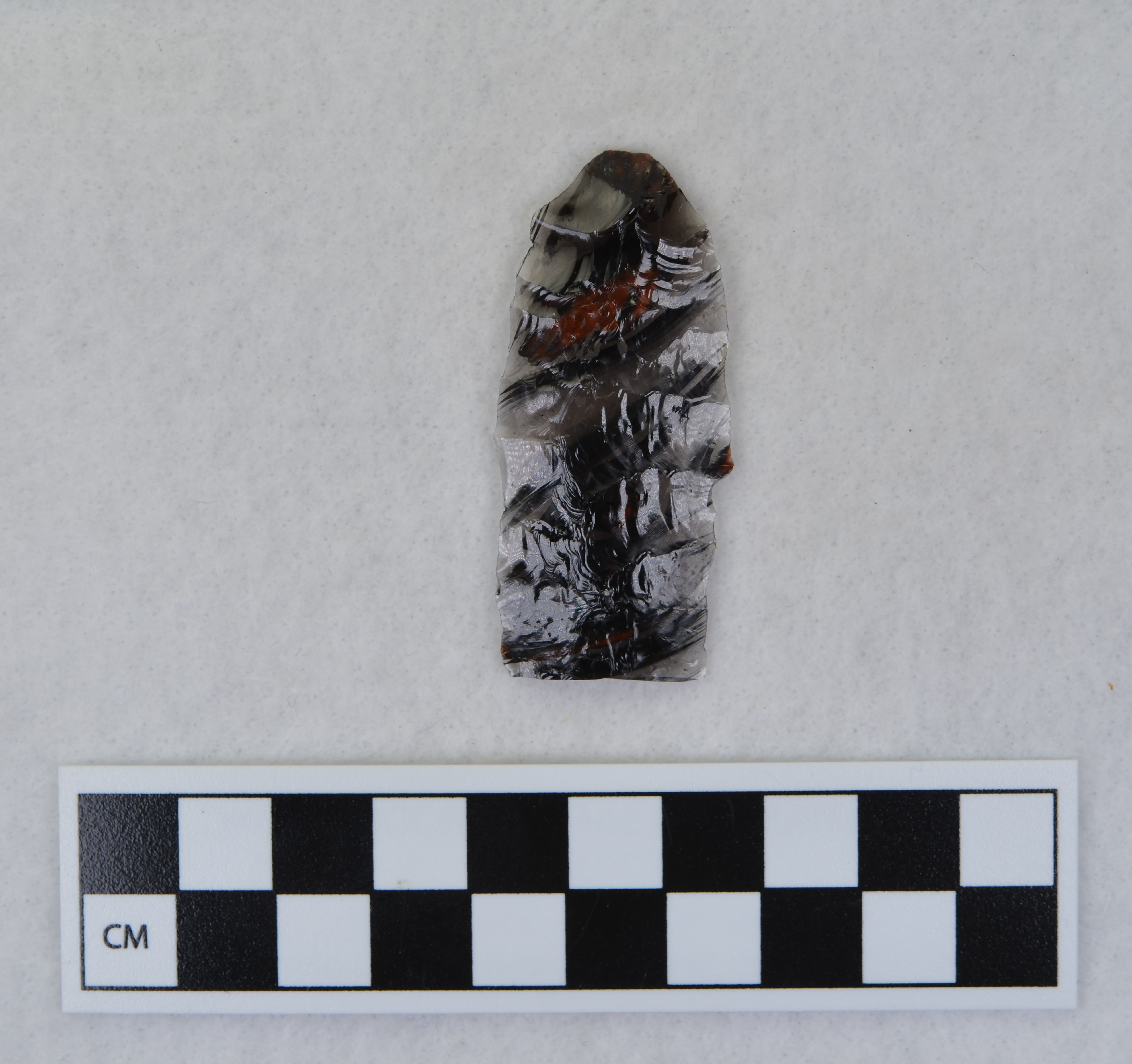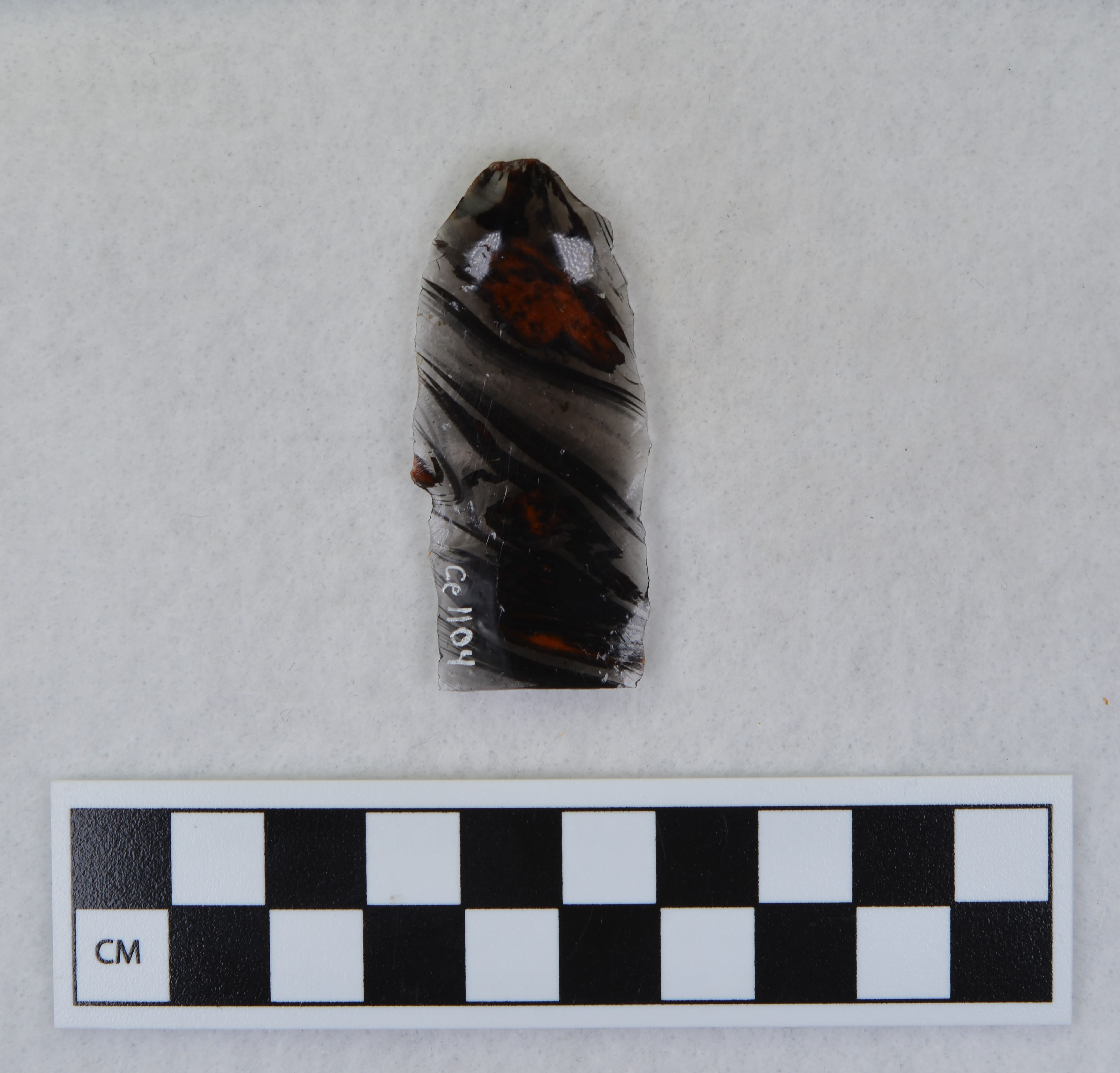 - This item was created by Donald E. Crabtree during his fluting experiments. The fluted point that this flake was detached is Ce.1101. Ce.1101 was fluted using rock anvil to support tip and hammerstone was used to remove channel flake. Gene Titmus noted that the distal end ground and the platform were ground.