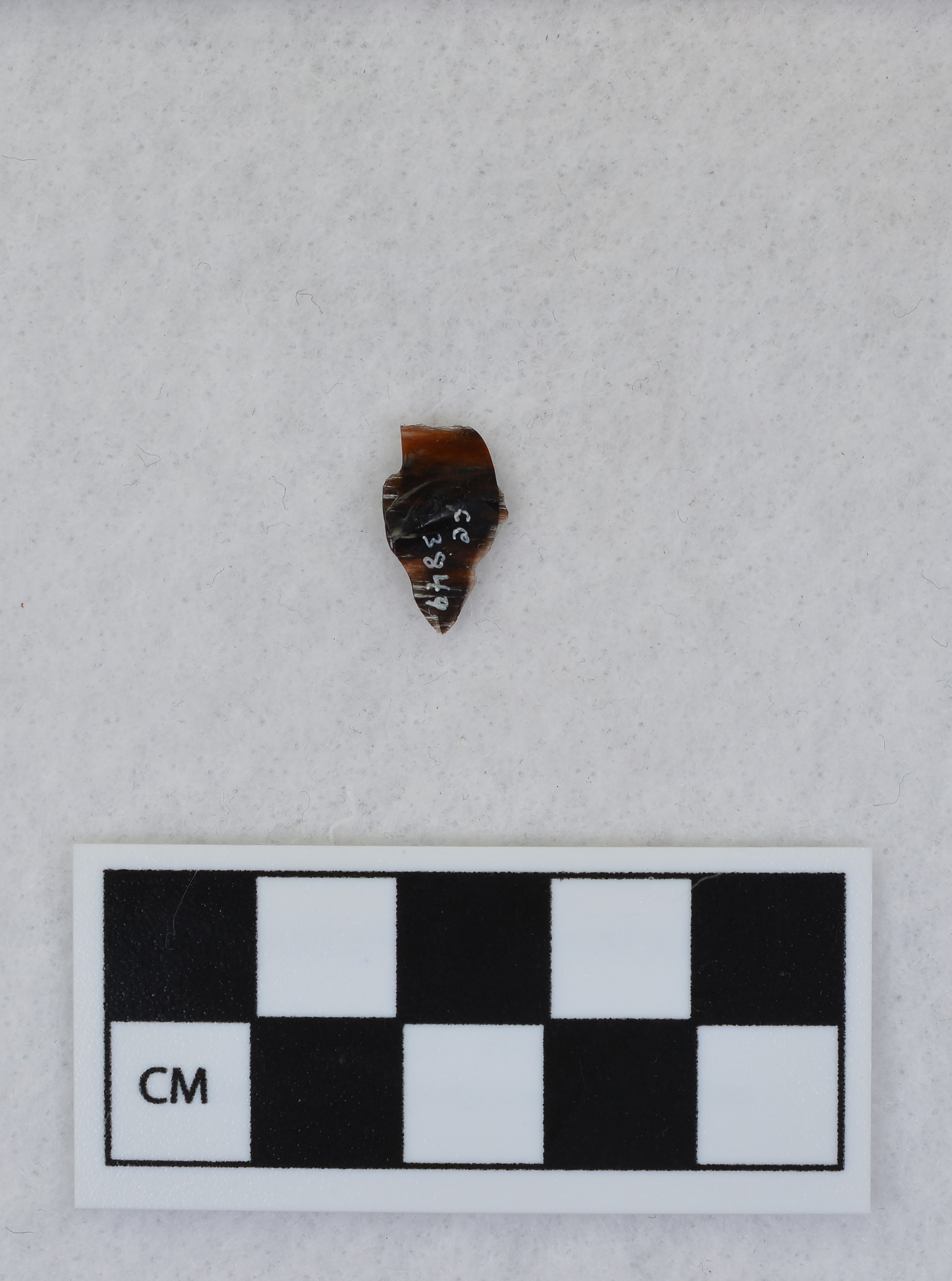 - A channel flake, distal end, from a Clovis point created by Donald E. Crabtree. This object mends with seven other objects in the collection; Ce.3845 - Ce.3852. The object was made using percussion fluting with a hammerstone while the distal end rested on an anvil. Ce.3847, Ce.3848, and Ce.3849 make up the channel flake from the labeled side of the object.