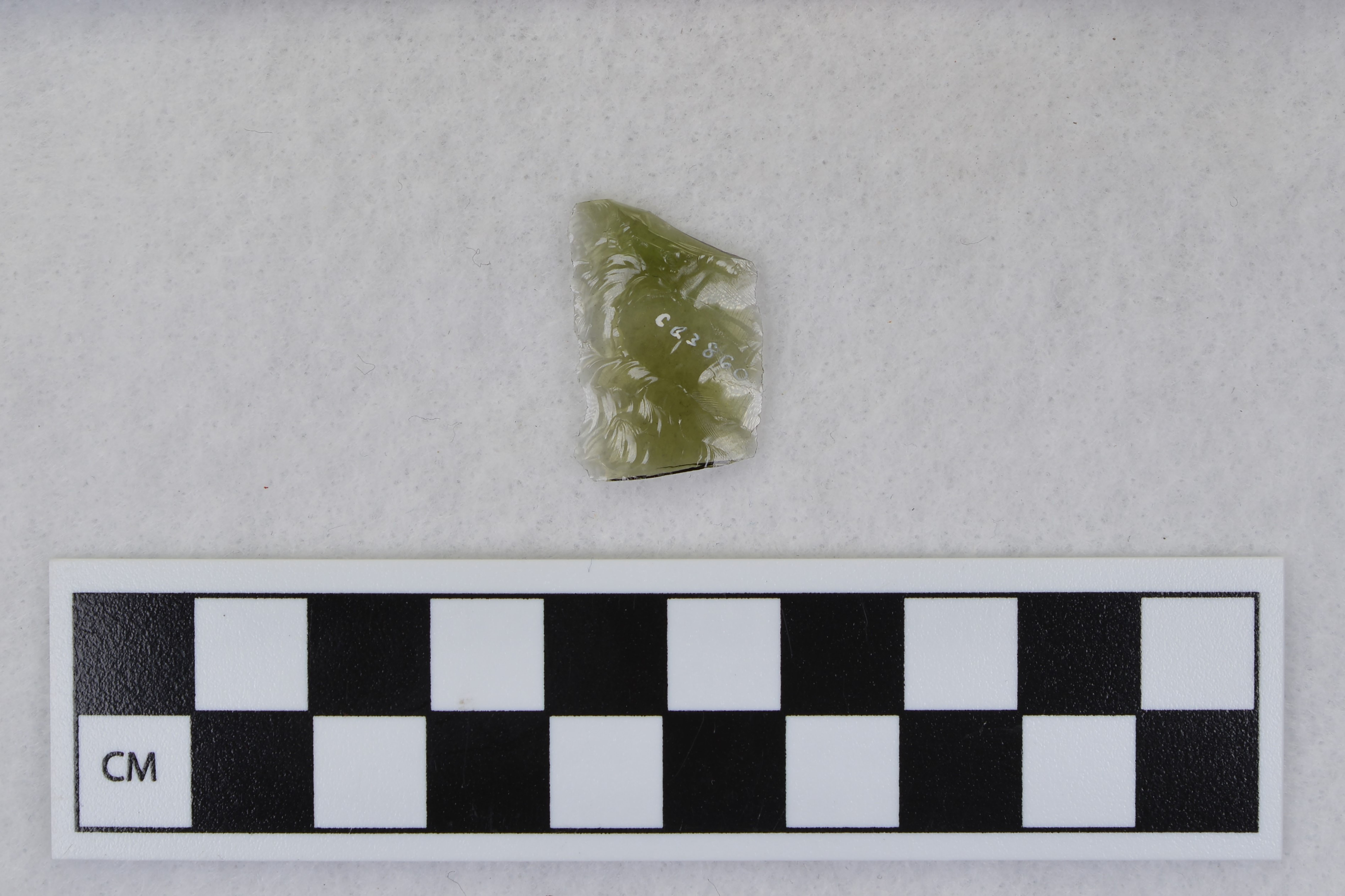 - Channel, distal, mends w/Ce.3861. Ce.3860 and Ce.3861: both fragments are transparent, green and may be either glass or obsidian. (MAP)