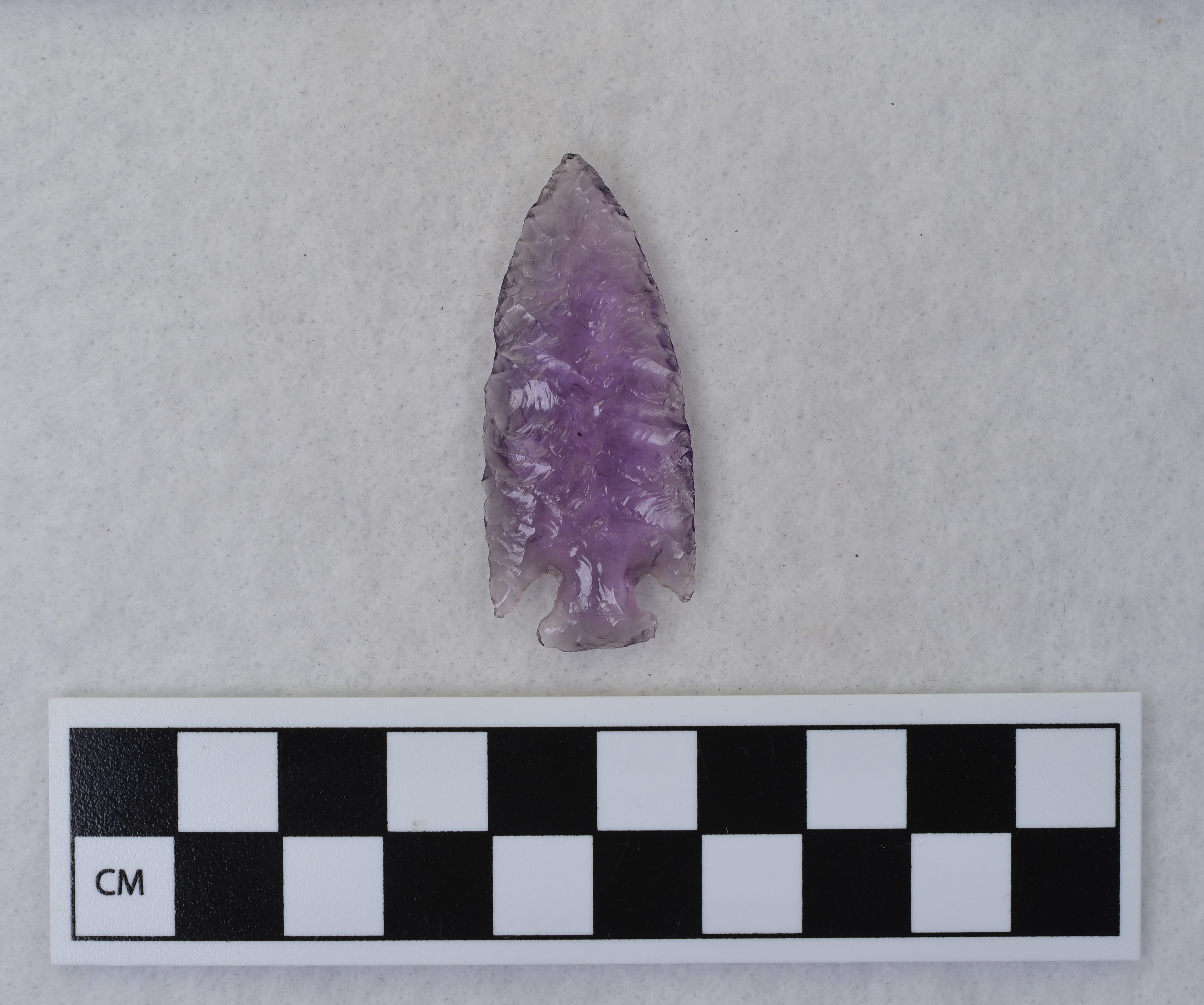 - Donald E. Crabtree made this corner notched point from old amythest glass.
