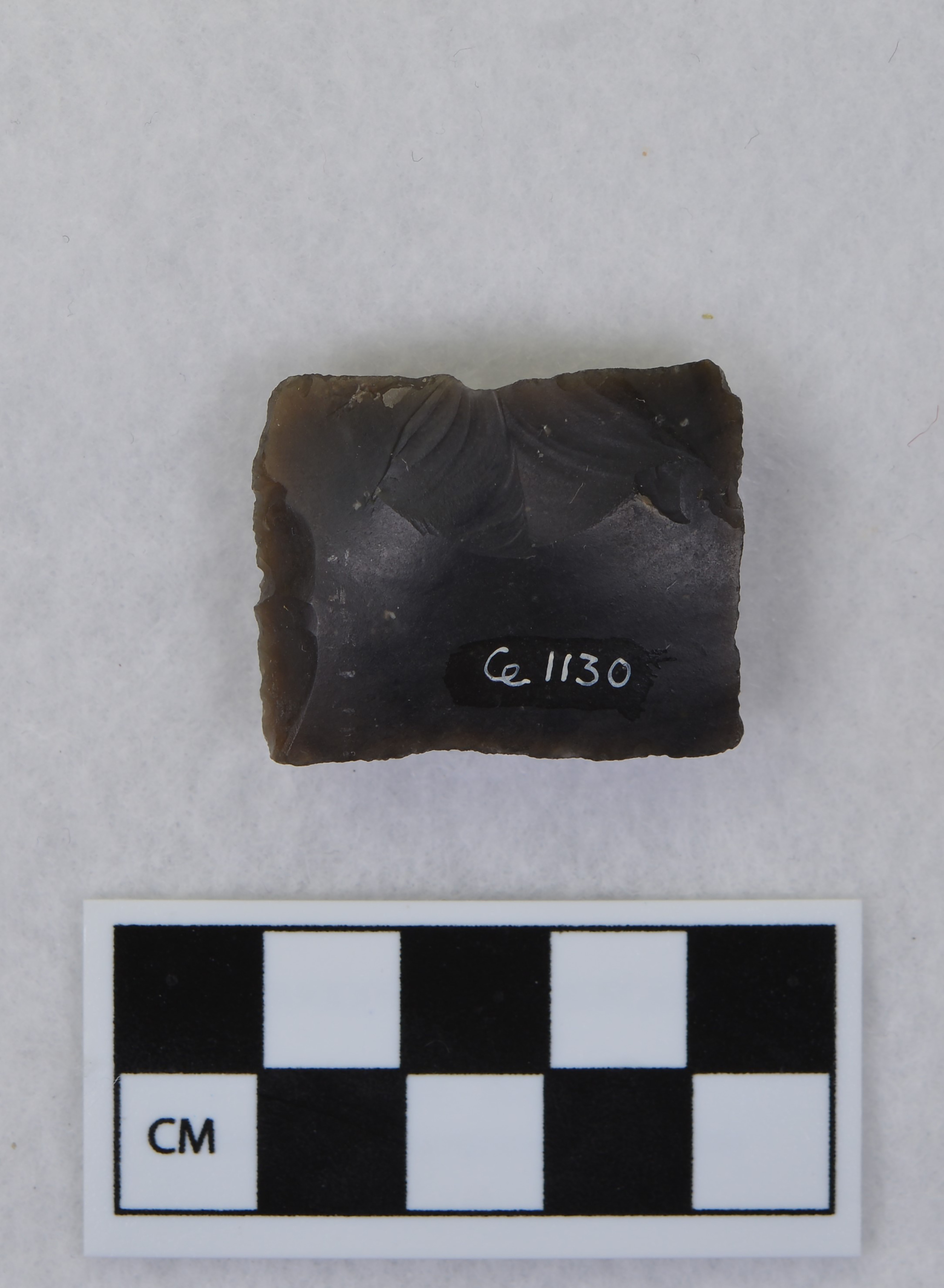 - English gunflint, it is unclear from the notes if this and associated pieces were made by Donald E. Crabtree or collected by him. Ce.1126 - Ce.1130 are associated with Ce.1119.